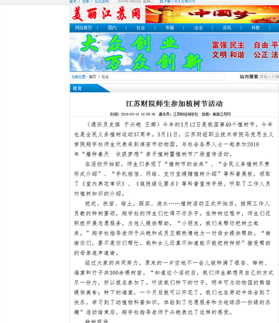 (通讯员史琪 于兴艳 王娜)今年的3月12日是我国第40个植树节,今年也是全民义务植树运动37周年。3月11日,江苏财经职业技术学院马克思主义学院翔宇社师生代表来到淮安市动物园,与社会各界人士一起参加2018年“播种春天 收获梦想”亲子植树暨植树节广场宣传活动。