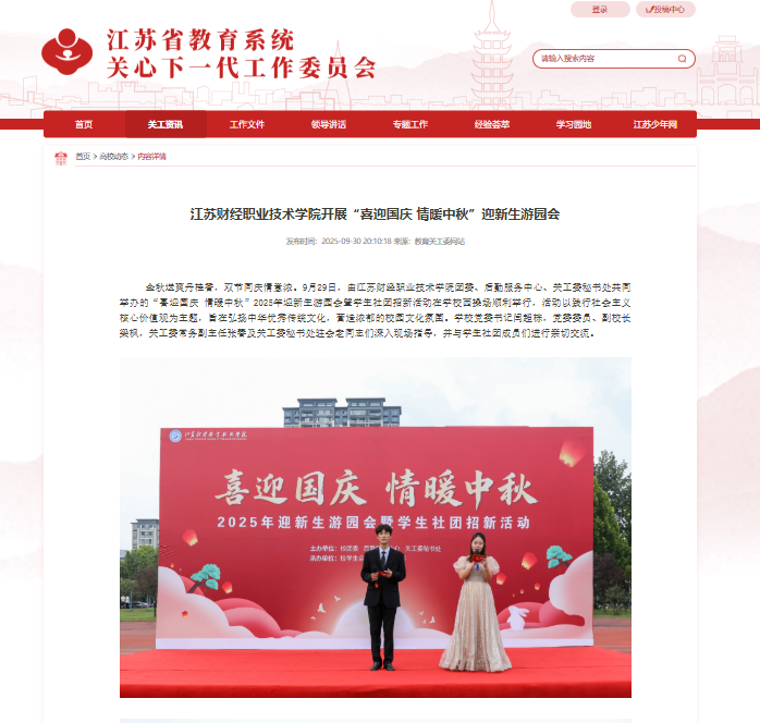 金秋送爽丹桂香,双节同庆情意浓,9月29日,由江苏财经职业技术学院团委、后勤服务中心、校关工委秘书处共同举办的“喜迎国庆 情暖中秋”2025年迎新生游园会暨学生社团招新活动在学校西操场顺利举行,活动以践行社会主义核心价值观为主题,旨在弘扬中华优秀传统文化,营造浓厚的校园文化氛围。学校党委书记闫超栋,党委委员、副校长梁枫,关工委常务副主任张春及关工委秘书处驻会老同志们深入现场指导,并与学生社团成员们进行亲切交流。