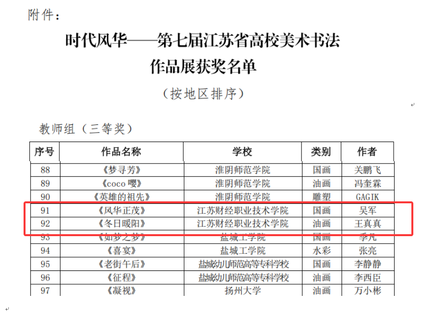 近日,由江苏省教育厅主办的“时代风华——第七届江苏省高校美术书法作品展”圆满收官。本次作品展吸引全省一百余所高校踊跃投稿,共收到各类美术书法作品5030件。经过严格的初评、复评环节,最终评选出各级奖项。我院教师吴军的作品《风华正茂》、王真真的作品《冬日暖阳》,在全省本科及专科院校教师组的876件参赛作品中脱颖而出,双双荣获教师组三等奖,为学院赢得了荣誉。