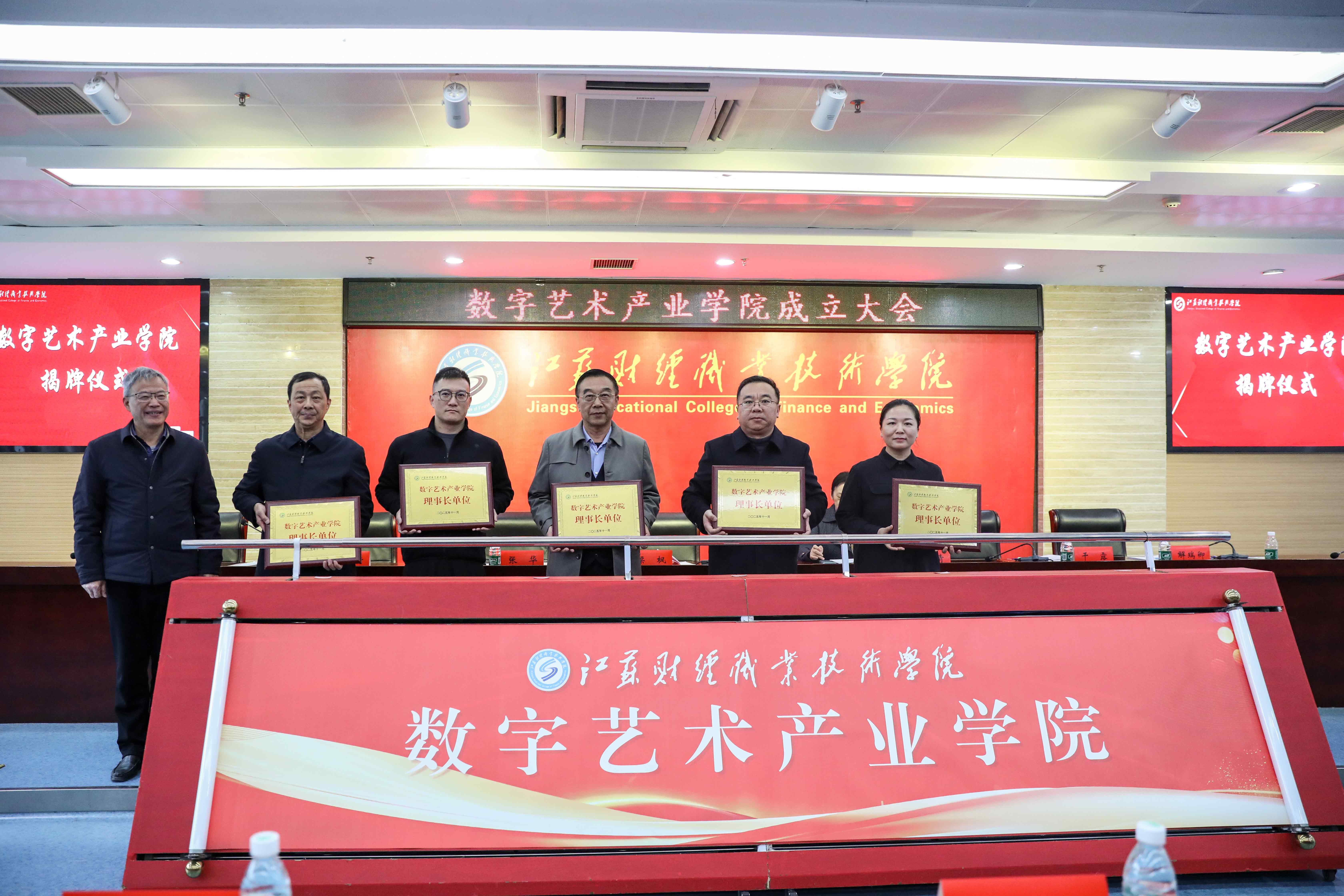会上,五家理事长单位代表共同为数字艺术产业学院揭牌。在授牌仪式上,梁枫、鲍建青、解瑞卿分别为理事长单位、副理事长单位和理事单位授予铜牌、颁发证书。
