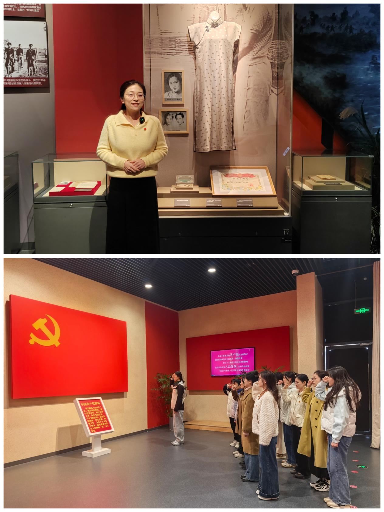 第一站“追寻红色足迹,传承铁军精神”:全体党员教师怀着崇敬之情参观了新四军纪念馆。在馆内,一件件斑驳的枪械、一幅幅珍贵的历史照片、一幕幕战斗复原场景,把大家带回到了那个烽火连天的抗战岁月,再次重温了新四军在抗日战争中的英勇事迹。支部教师关琪进行了现场教学,“一件旗袍”让我们知晓了烈士王海纹那一代青年人为追求民族独立与解放而奋不顾身的身影,令人动容。参观完毕,全体党员面向党旗重温入党誓词,铿锵誓言宣示着马克思主义学院教师为党育人、为国育才的坚定初心。
