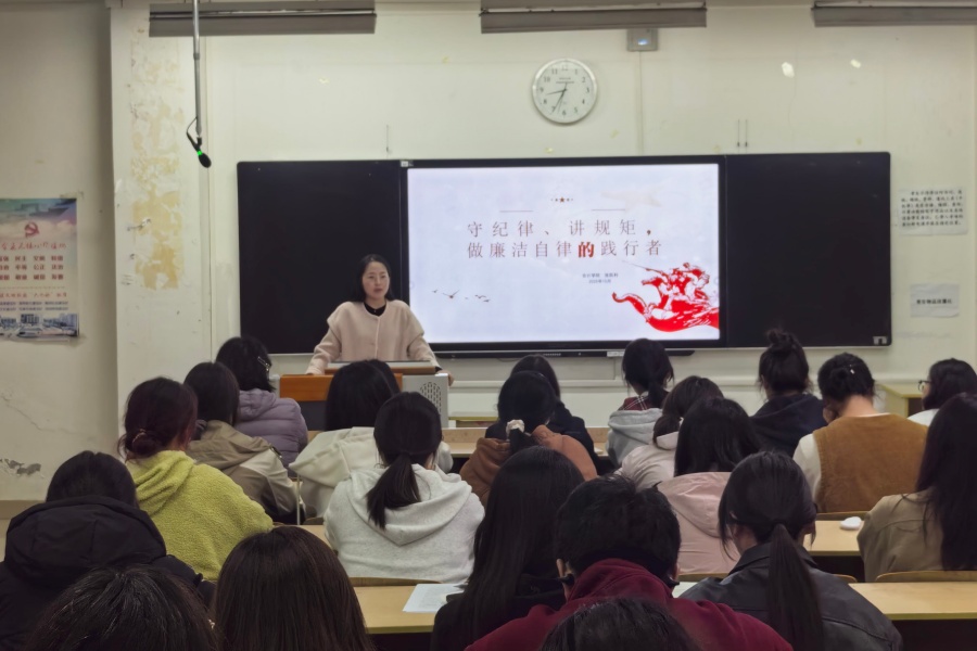 党总支书记罗斌率先垂范,以《严守纪律红线,扣好第一粒扣子》为题,为全体师生党员讲授专题党课,结合高校领域典型案例,深刻阐述了新时代廉洁文化的内涵要求,引导大家增强廉洁从政、廉洁从教、廉洁修身的自觉性。