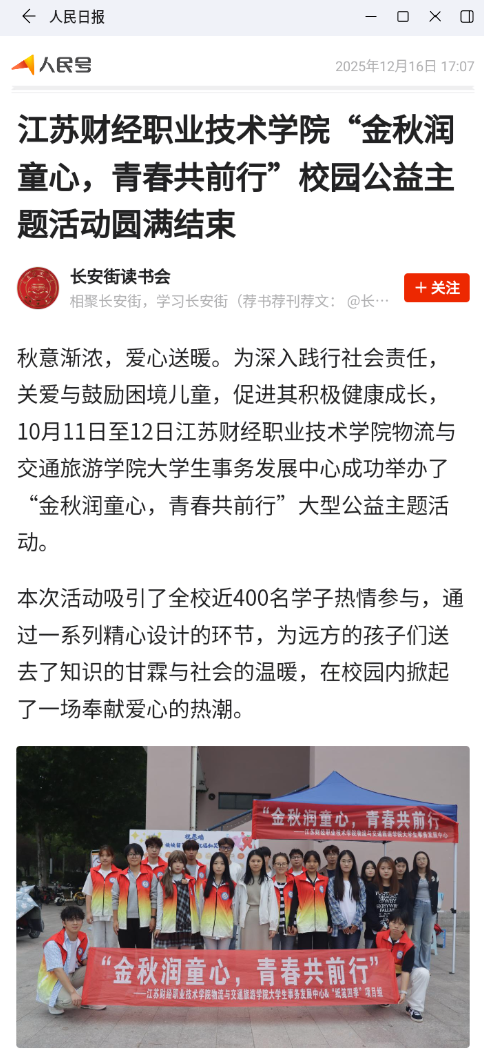 秋意渐浓,爱心送暖。为深入践行社会责任,关爱与鼓励困境儿童,促进其积极健康成长,10月11日至12日江苏财经职业技术学院物流与交通旅游学院大学生事务发展中心成功举办了“金秋润童心,青春共前行”大型公益主题活动。