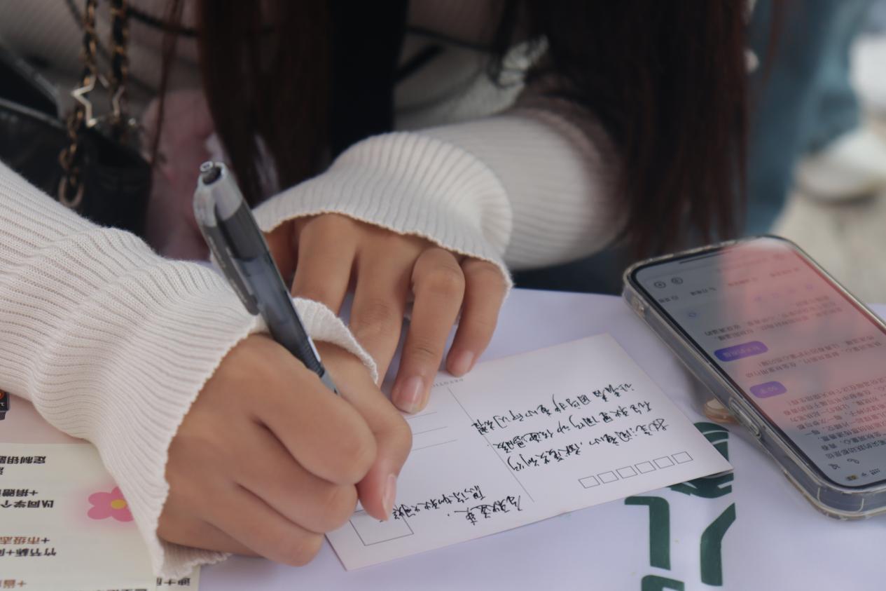 “愿你像一颗勇敢的种子,冲破泥土,茁壮成长”、“知识是通往世界的窗口,希望这些书能带你看到更美的风景”……在明信片书写区,同学们俯身案前,神情专注,将心底最真挚的祝福与鼓励凝聚于笔端。一行行温暖的字句,承载着大学生们对困境儿童的深切关爱与殷切期望。这些满载心意的明信片将随同收集到的书籍一起,跨越山海,送到孩子们手中。这不仅是一次物质的馈赠,更是一次心灵的对话与情感的联结,让同学们在付出中学会珍惜,在关爱中收获成长。