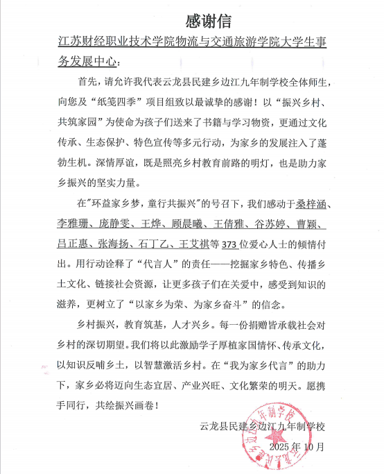 此次主题活动不仅仅是一次简单的公益捐赠,更是一次深刻的心灵洗礼与有效的爱心传递。它让困境儿童真切感受到了来自社会的关注与支持,也为大学生们提供了一个践行社会责任、实现自我价值的宝贵平台。未来,江苏财经职业技术学院物流与交通旅游学院大学生事务发展中心将继续秉持公益初心,持续关注困境儿童的成长与发展需求,积极拓展帮扶形式,为他们提供更多元、更有效的支持,让爱的接力棒永远传递,让公益的种子在更多人心中生根发芽,结出硕果。