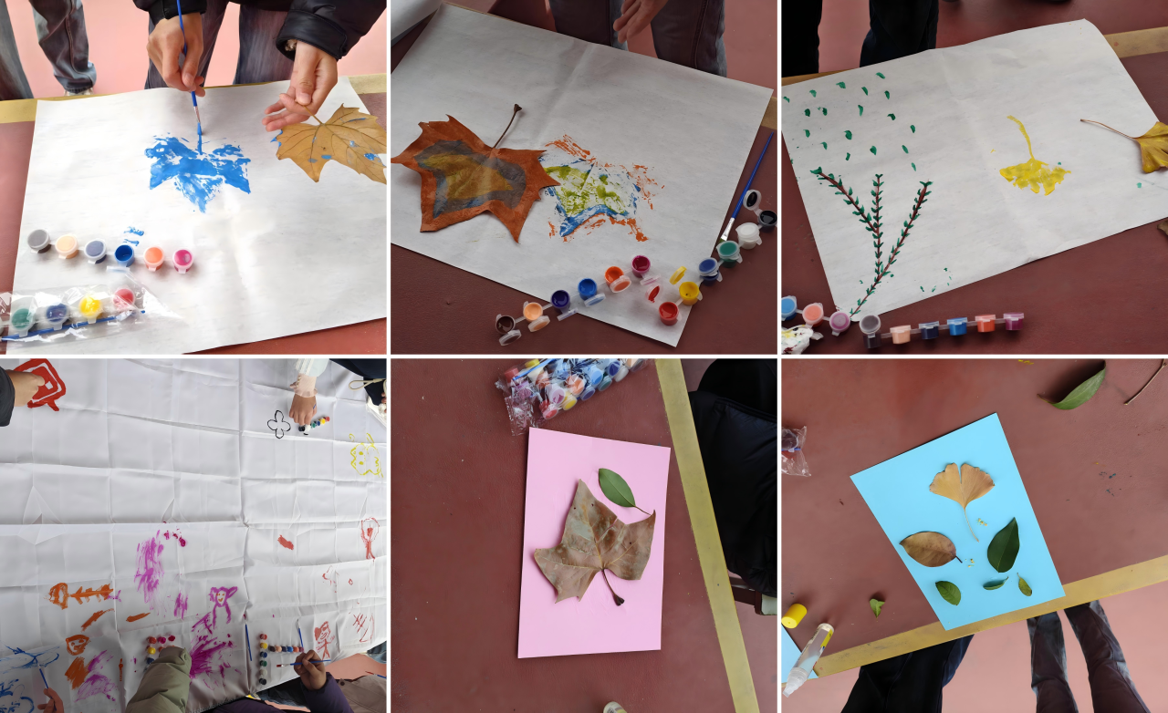 活动设置了三大核心环节,让学生在沉浸式体验中舒缓身心:一是自然拓印创作。学生们以宣纸为载体,运用现场采集的自然素材,搭配各色颜料进行拓印,在材质触感与色彩碰撞中释放隐性情绪,收获身心松弛感。二是绘制情绪调色盘。工作人员在操场铺设大幅画布,学生们可根据自身情绪状态,选用具有象征意义的色彩,通过笔刷、自然物或手指等多种方式自由创作,直观呈现内心感受。三是自然拼贴创作。学生们收集落叶、花瓣等自然元素,在卡纸上进行创意拼贴,将对生活的感悟与情绪寄托于作品之中。