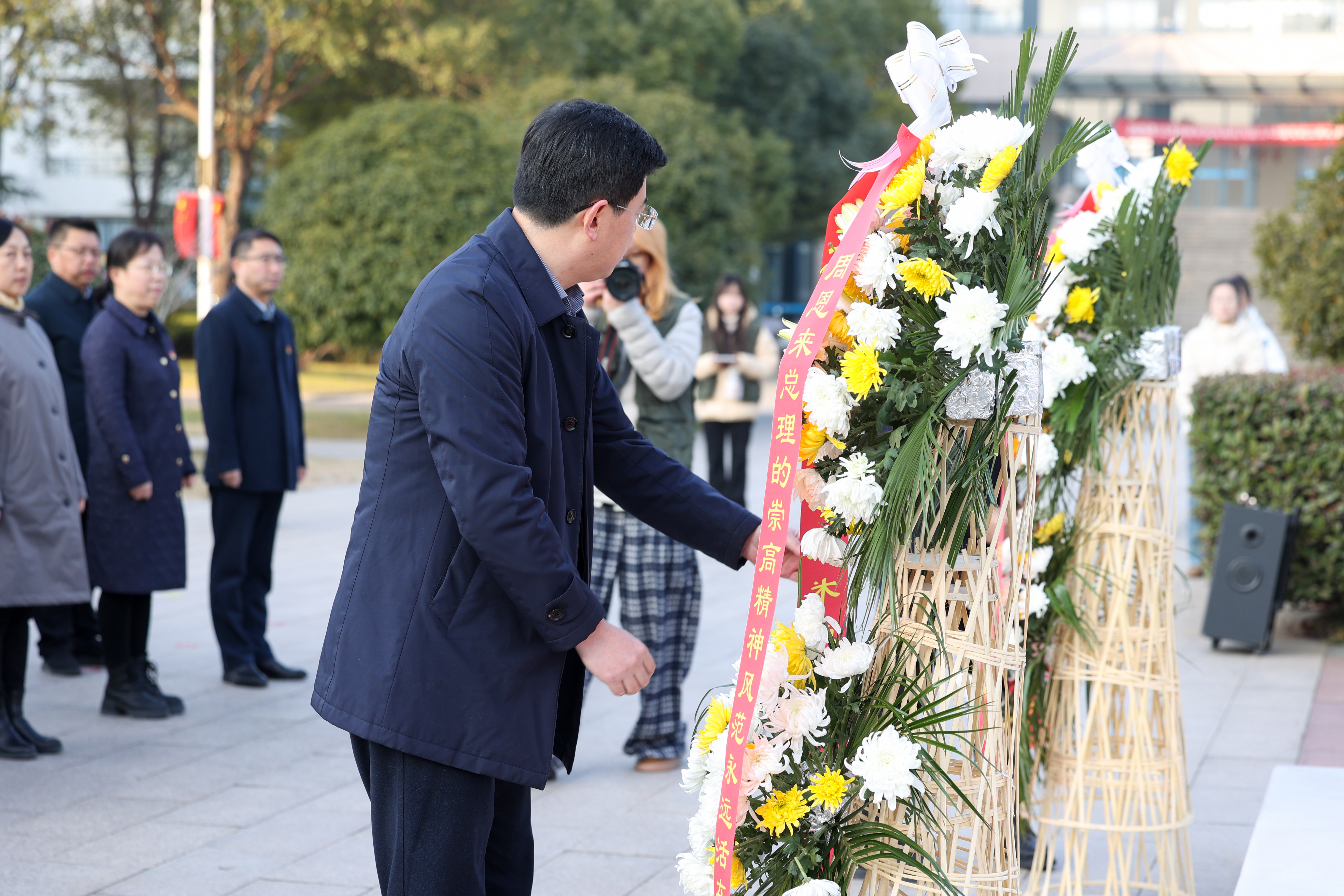敬献花篮环节,4名学生代表迈着沉稳的步伐,缓缓走向周恩来铜像,将承载着全校师生深切思念的花篮整齐摆放在铜像基座前。校党委书记闫超栋、校长张维共同上前,小心翼翼地整理花篮缎带,让“深切缅怀敬爱的周恩来总理”的字样醒目舒展。整理缎带后肃立鞠躬,致以无限哀思。全体人员集体默哀,表达对伟人的无限敬仰与深切缅怀。
