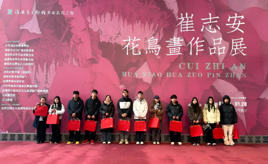 1 月 9 日上午,法文学院受邀组织师生代表走进淮安市美术馆,全程参与 “淮安市美术馆名家系列工程:崔志安花鸟画作品展” 开幕式,并同步开展现场教学观展活动。此次活动是数字产业学院推动美育与专业教育深度协同的重要实践,通过校馆合作搭建起传统文化与数字产业无缝衔接的实践平台,让学生走出课堂、直面名家佳作,在真实的艺术浸润中深化对传统艺术与现代设计融合路径的认知,助力学生开阔艺术视野、夯实创意设计基础,为培育兼具深厚审美素养与创新实践能力的数字产业人才注入强劲动力。