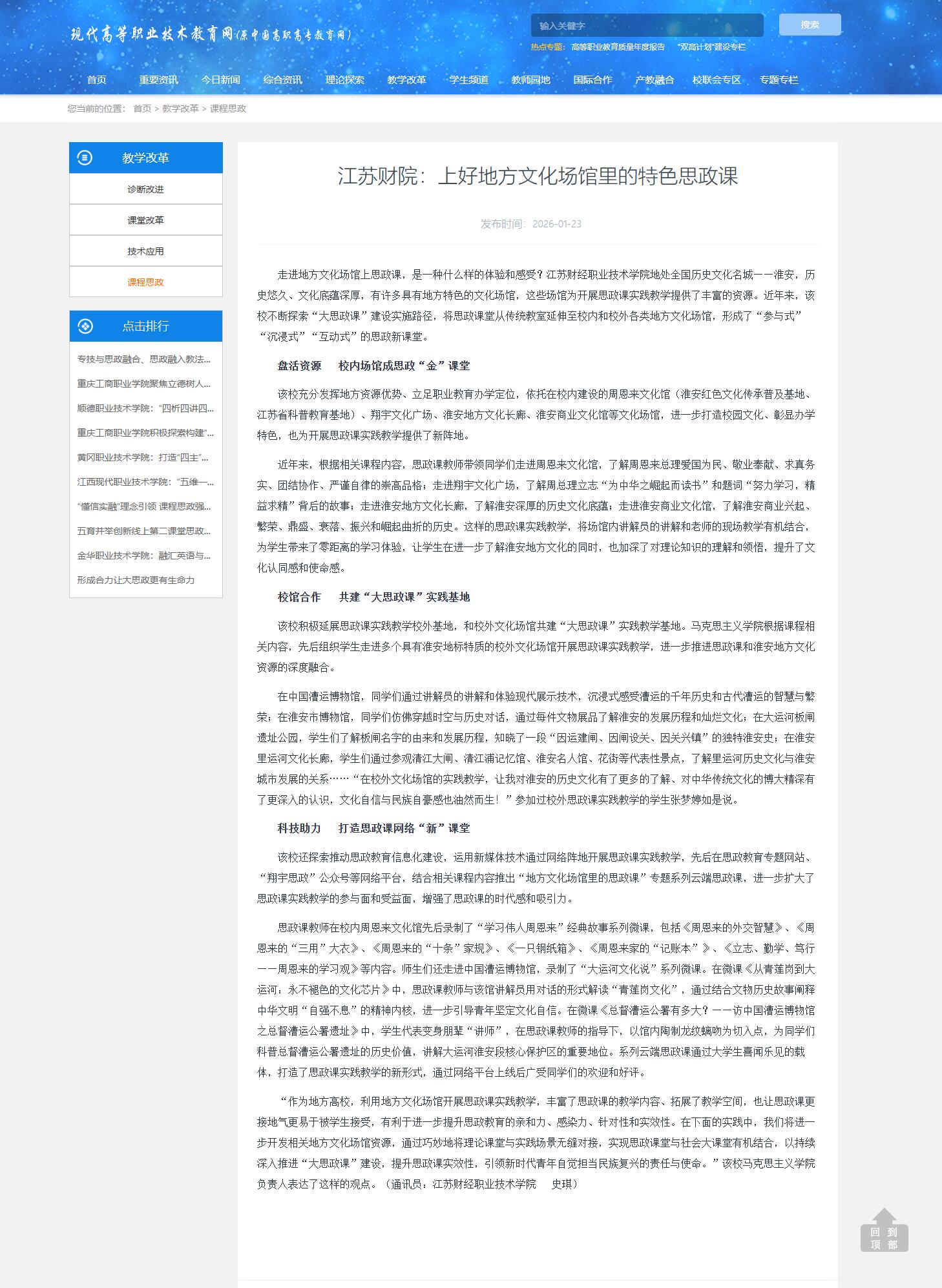 该校还探索推动思政教育信息化建设,运用新媒体技术通过网络阵地开展思政课实践教学,先后在思政教育专题网站、“翔宇思政”公众号等网络平台,结合相关课程内容推出“地方文化场馆里的思政课”专题系列云端思政课,进一步扩大了思政课实践教学的参与面和受益面,增强了思政课的时代感和吸引力。