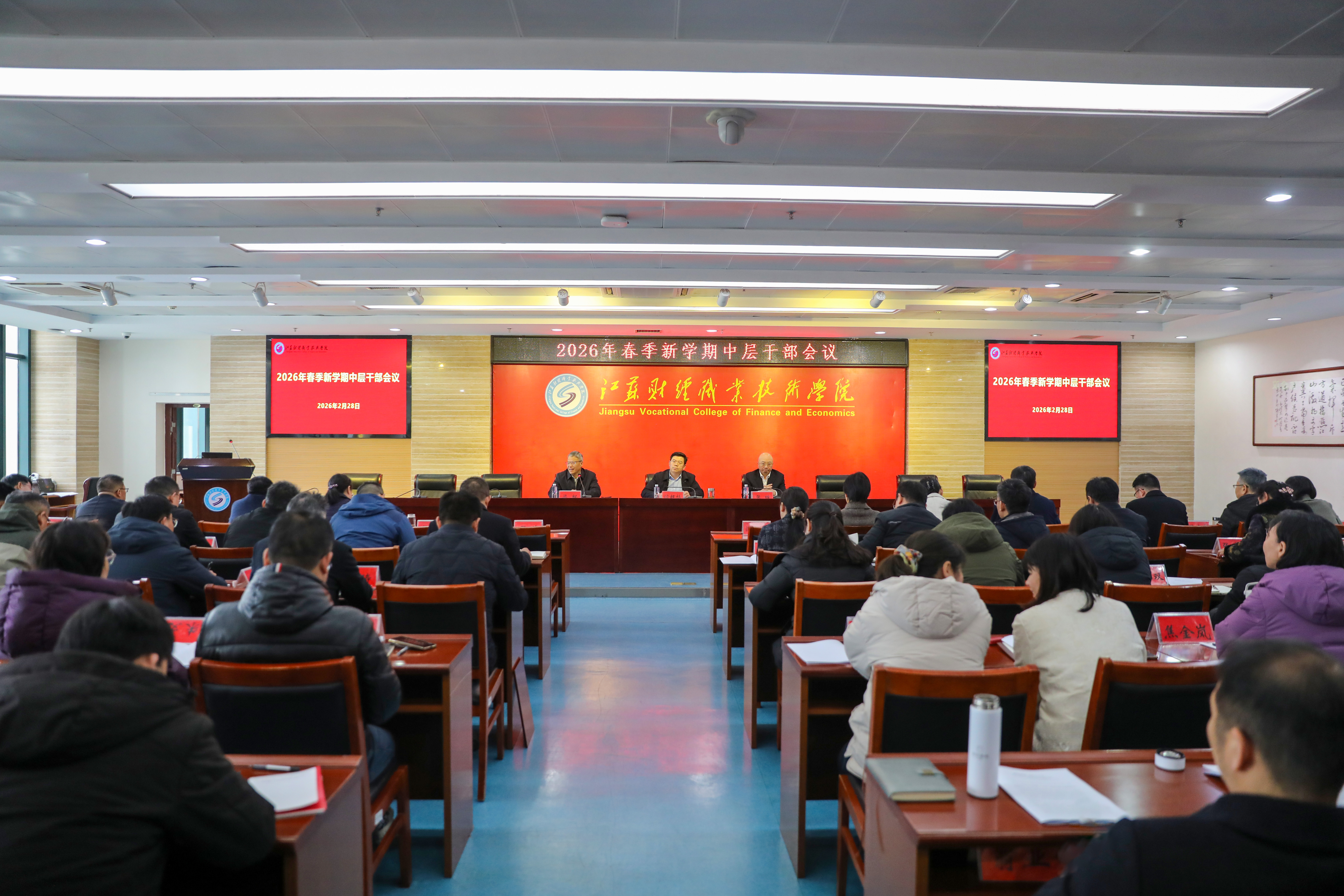 校长张维对新学期开学准备工作作出部署,解读了《江苏财经职业技术学院2026年工作要点》,围绕加强党对学校工作的领导、提高人才培养质量、推动教育教学改革、打造高水平师资队伍、拓展开放办学格局、增强社会服务能力、提升学校治理效能、建设平安和谐校园等八个方面提出了明确要求。他指出,在教学与科研工作中,要聚焦具身智能等未来产业及生产性服务业人才需求,紧跟产业发展与技术前沿。同时重点强调了要以安全保障为底线,时刻盯紧盯牢校园安全稳定,扎实推进安全生产“六化”建设,持续深化安全风险防控体系建设,定期开展安全隐患排查整治,筑牢校园安全稳定防线。