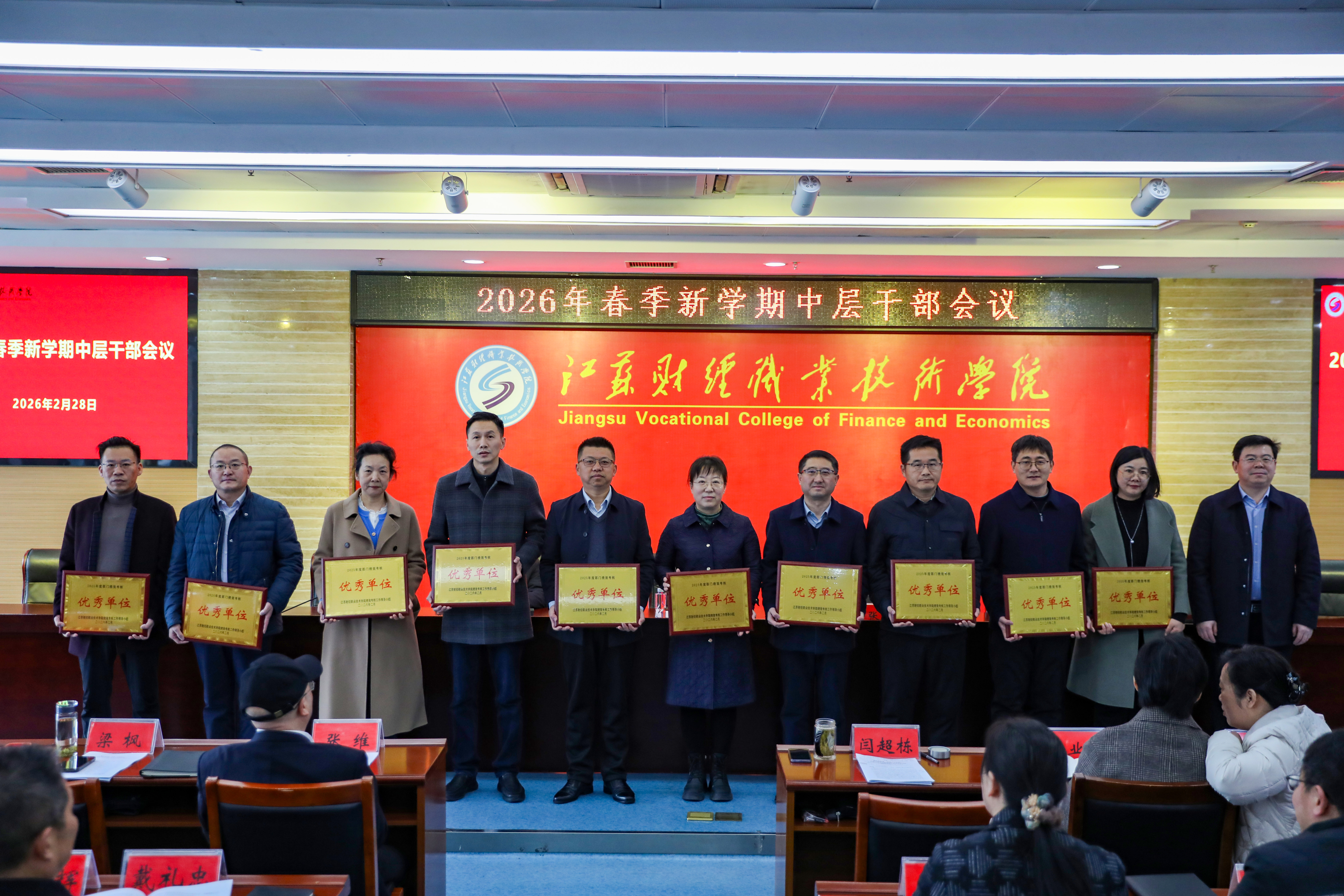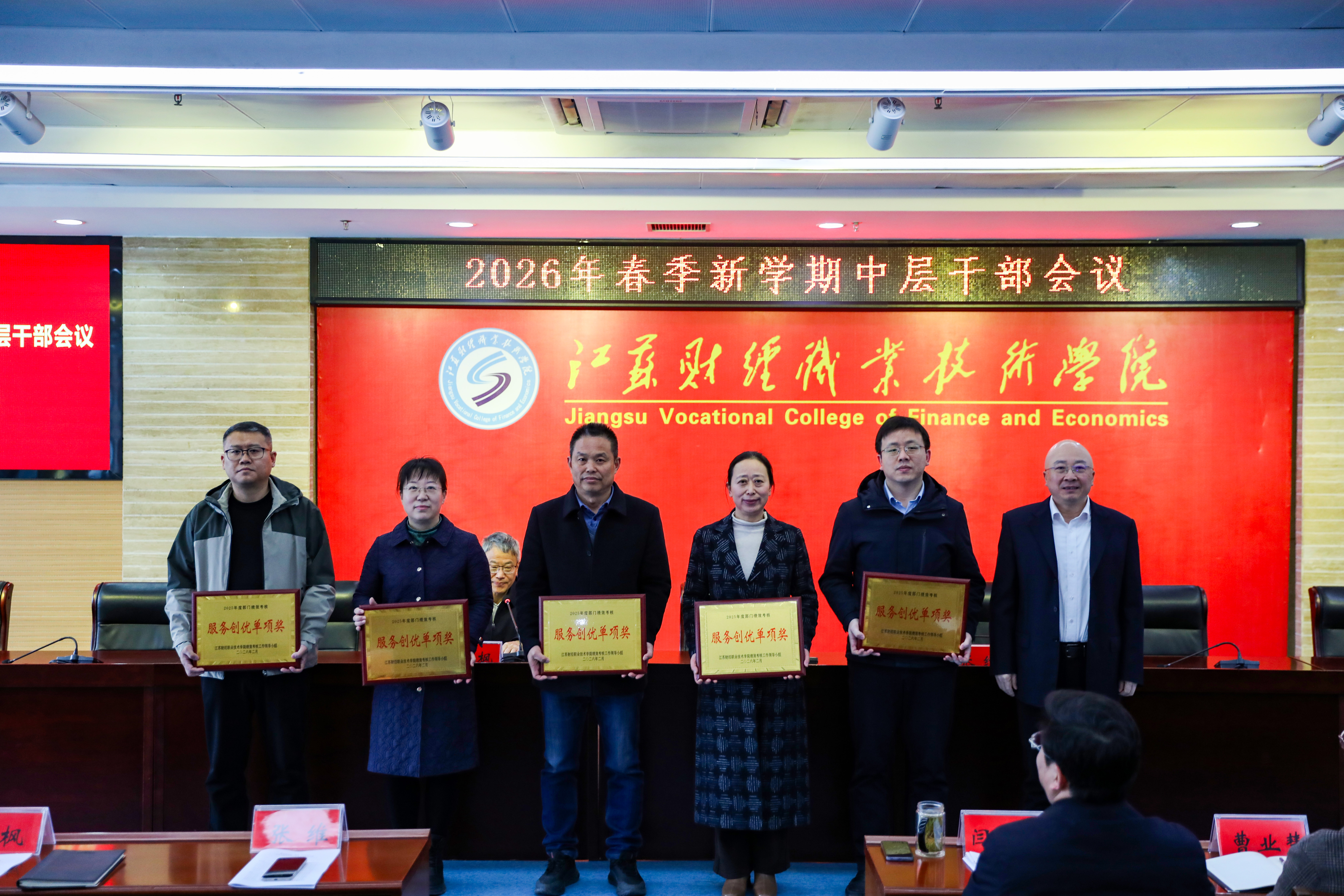 会上,校长张维为获得2025年度绩效考核服务创优奖的财务处、总务处、审计处、商务英语学院、马克思主义学院等部门颁奖。党委书记闫超栋为获得2025年度绩效考核优秀的科技处、组织部、宣传部、办公室、学生处、团委、发展规划处、金融学院、基础教学部、智能工程技术学院等部门颁奖。
