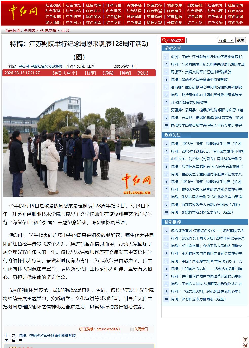 今年的3月5日是敬爱的周恩来总理诞辰128周年纪念日。3月4日下午,江苏财经职业技术学院马克思主义学院师生在该校翔宇文化广场举行“海棠依旧 初心如磐”主题纪念活动,深切缅怀周总理。