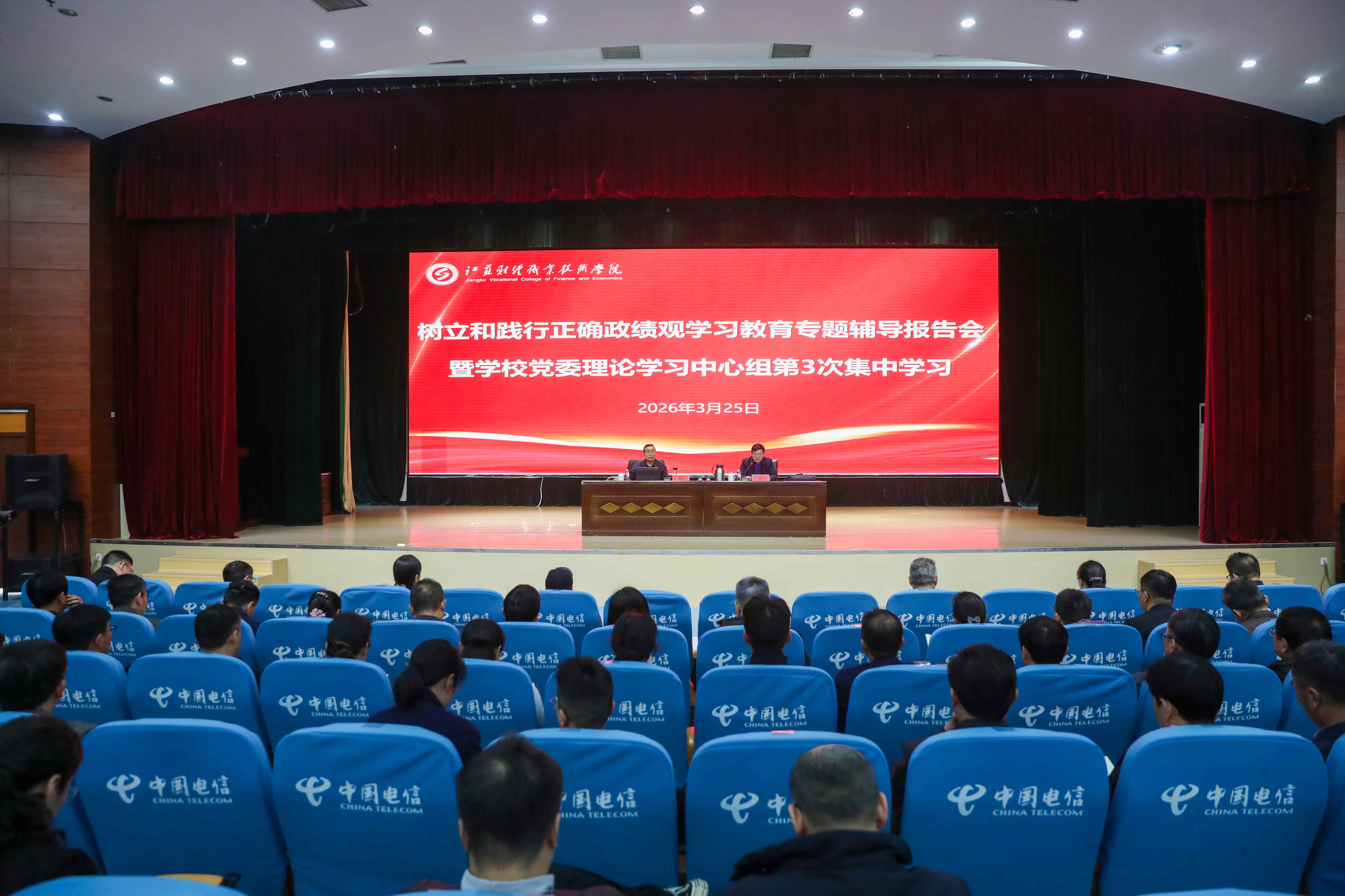 3月25日下午,我校举行树立和践行正确政绩观学习教育专题辅导报告会暨党委理论学习中心组2026年度第3次集体学习会(扩大),邀请江苏省委党校王金水教授作专题辅导报告。校党委书记闫超栋主持会议并讲话,学校两级理论学习中心组成员、各民主党派、统战团体班子成员、马克思主义学院全体教师和全体辅导员参加会议。