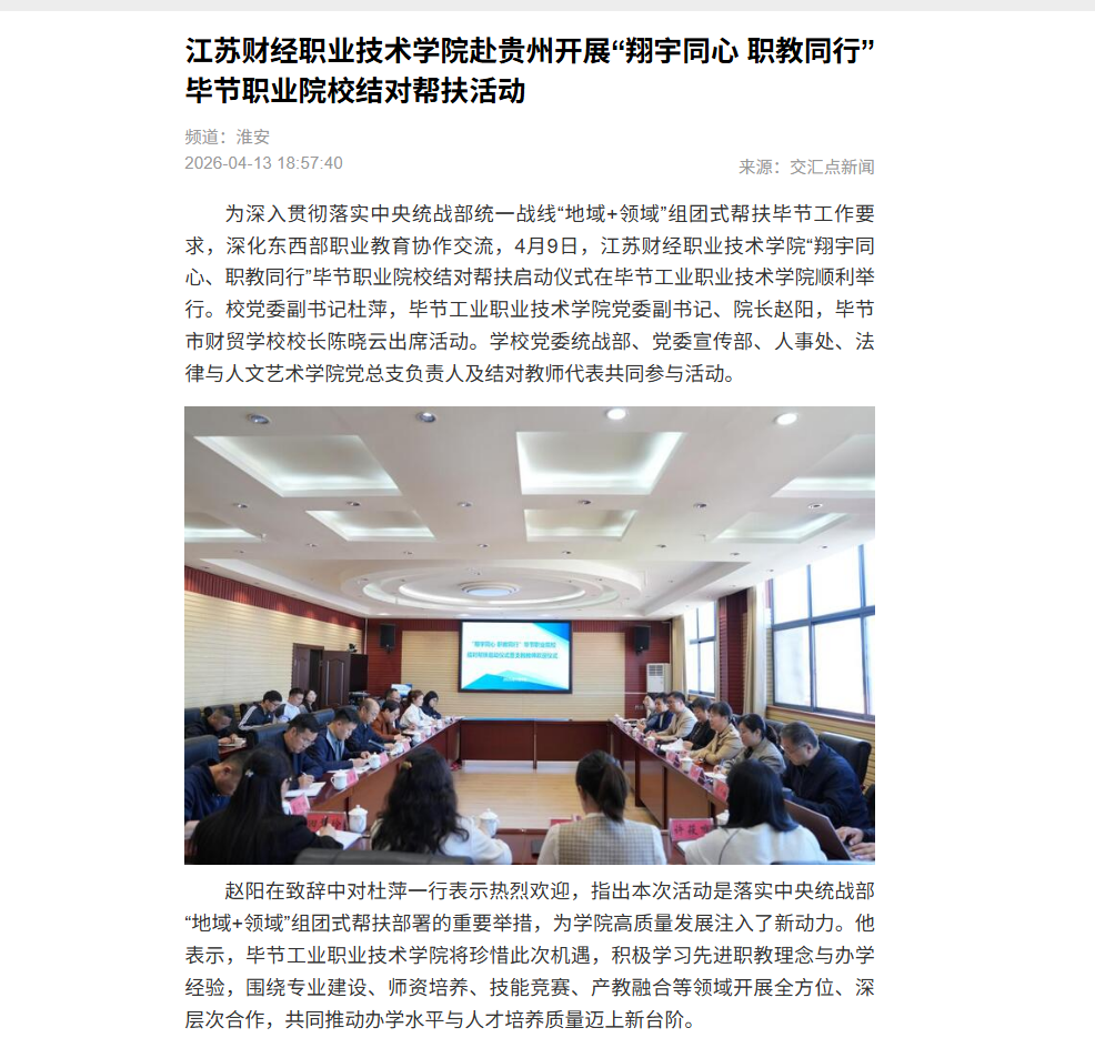 为深入贯彻落实中央统战部统一战线“地域+领域”组团式帮扶毕节工作要求,深化东西部职业教育协作交流,4月9日,江苏财经职业技术学院“翔宇同心、职教同行”毕节职业院校结对帮扶启动仪式在毕节工业职业技术学院顺利举行。我校党委副书记杜萍,毕节工业职业技术学院党委副书记、院长赵阳,毕节市财贸学校校长陈晓云出席活动。学校党委统战部、党委宣传部、人事处、法律与人文艺术学院党总支负责人及结对教师代表共同参与活动。