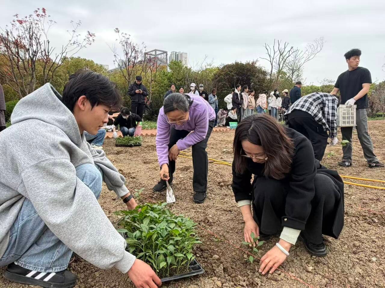 活动现场,春风和煦,泥土芬芳,一派热火朝天的劳动景象。在农研所专家的指导下,尹玉珍、赵林林与全体辅导员以身作则、率先垂范,带领同学们迅速投入劳作,用实际行动践行劳动精神,为同学们树立榜样。同学们作为活动的主体,热情高涨、积极主动,分组协作、分工明确,从翻土到播种,从覆土到浇水,同学们全程主动参与、亲力亲为,在躬身实践中感受农耕的乐趣,在协作配合中凝聚团队力量。