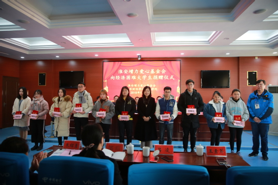 爱心基金会常务副理事长李增力向副校长梁枫授捐赠牌,淮安增力爱心基金会代表向经济困难大学生捐赠、颁发增力爱心基金会志愿者证书。
