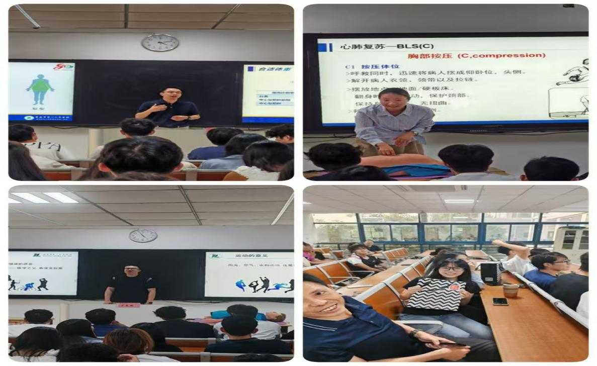 活动伊始,朱传荣医生结合精心准备的PPT,就“健康管理 赋能未来”这一主题进行了系统讲解。他从体重与健康的关系入手,结合实例分析了科学管理体重的重要性,并提供了实用的饮食建议和运动方案。随后,活动进入第二个环节——急救技能培训,荣贝思医生通过理论阐述与模拟演示,详细介绍了心肺复苏的适用场景、操作步骤及注意事项。部分师生还在专家的指导下进行了实操体验,初步掌握了这一挽救生命的关键技能。讲座的第三部分聚焦“运动损伤的预防和处理”。丁其瑞医生凭借丰富的骨科临床经验,列举了常见的运动损伤类型,并深入浅出地分析了其发生原因,讲解了常见运动损伤的处理方式。他特别强调了运动前热身、运动方式选择以及运动后放松的重要性,同时演示了损伤发生后的应急处理措施,如制动、冰敷、加压包扎等,为师生们的日常运动提供了科学、实用的指导。