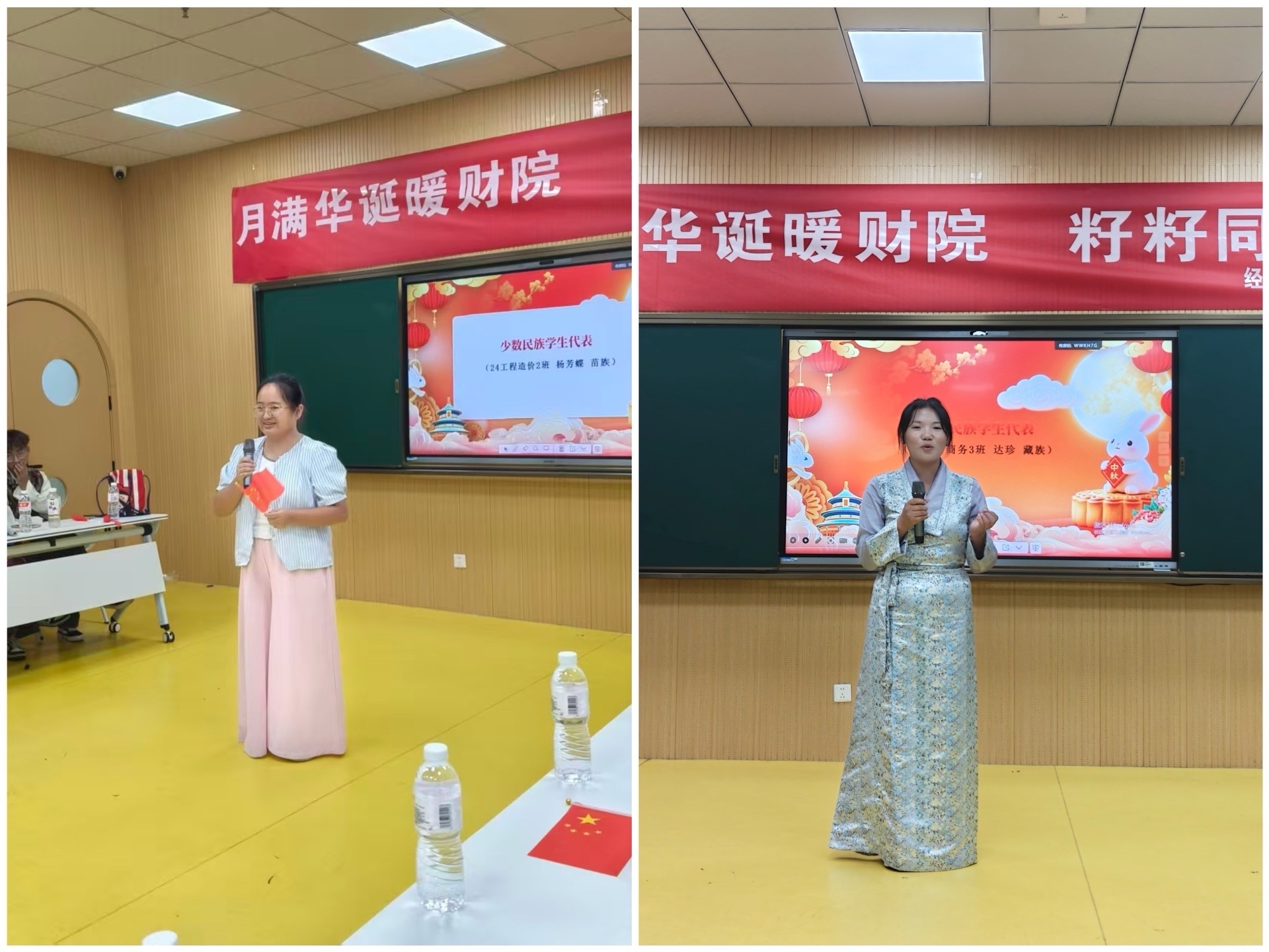在交流分享环节,来自24工程造价1班的苗族学生杨芳蝶、来自25电子商务3班的藏族学生达珍,分享了各自独特的民族文化、风俗习惯,以及来到淮安、来到财院后被温暖、被感动到的多个点滴瞬间,真诚而生动,温暖而有力量。