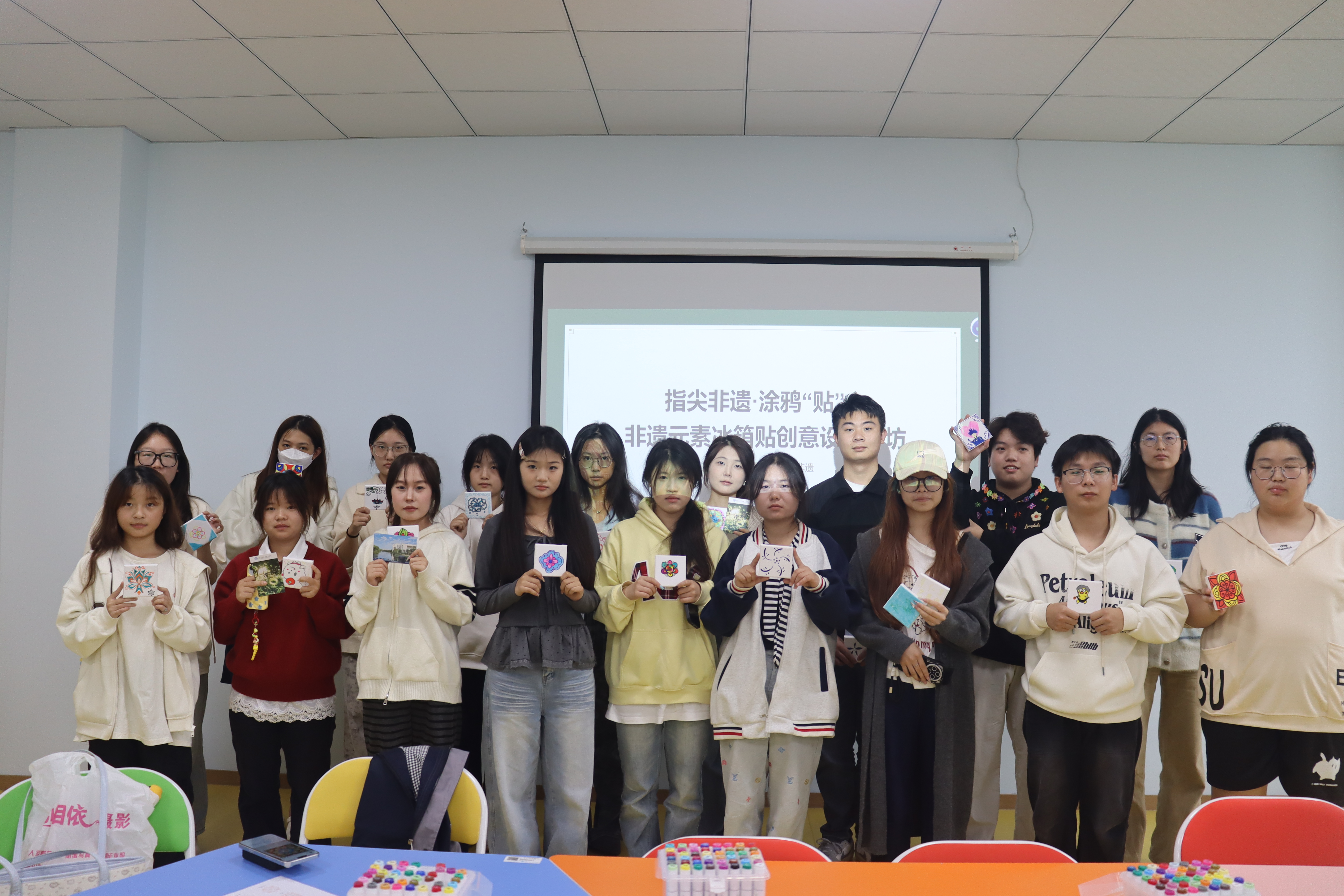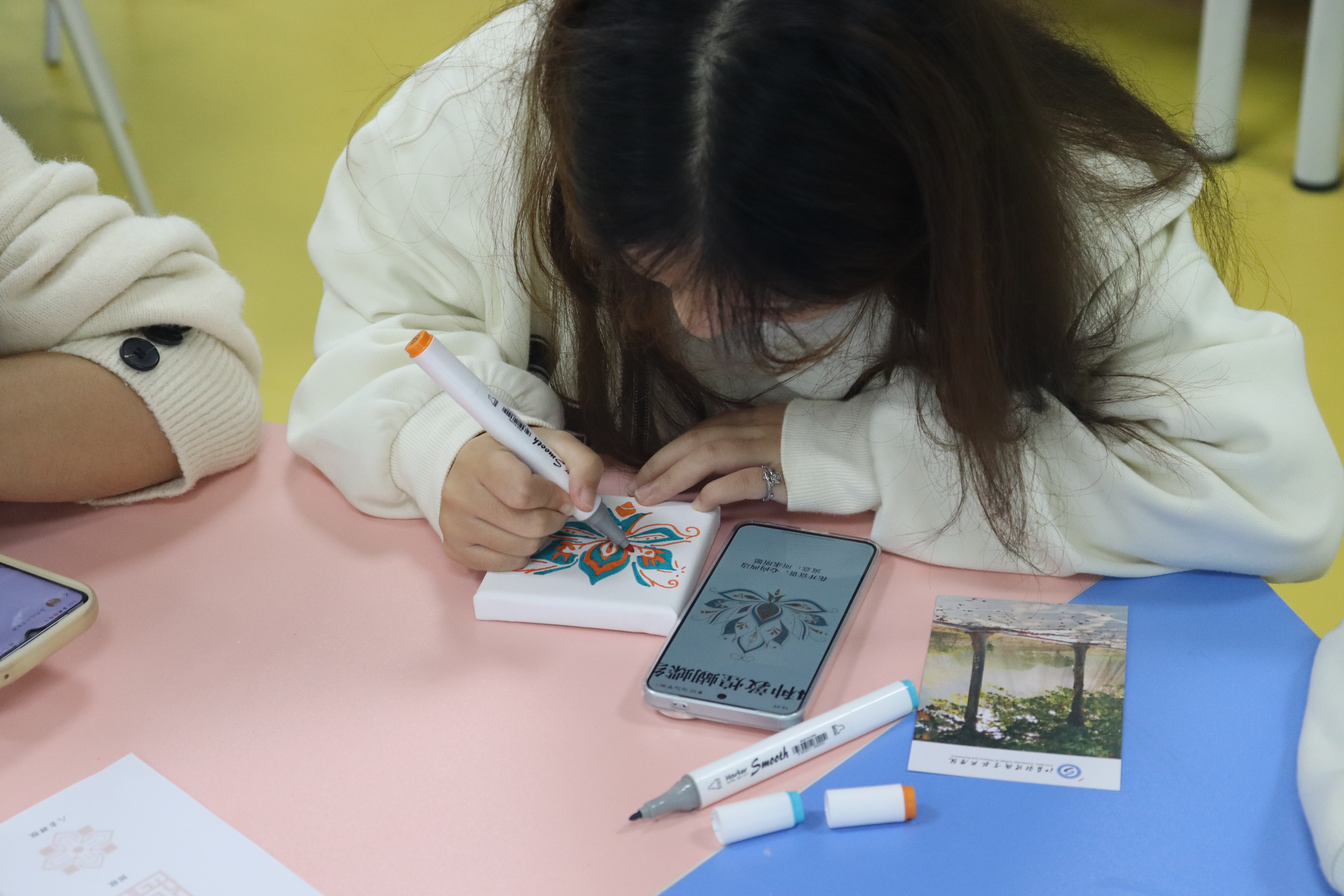 培训环节结束后,活动进入充满文化气息的非遗体验阶段。同学们近距离感受传统非遗纹样的艺术魅力,充分发挥创意与想象力,将经典纹样与个人审美相结合,精心制作独一无二的非遗主题冰箱贴。创作过程中,大家相互交流技巧、分享灵感,现场氛围轻松愉悦。非遗体验不仅让同学们领略了传统文化的博大精深,更在动手实践中舒缓了学习生活压力,实现了心理调节与文化传承的有机融合。