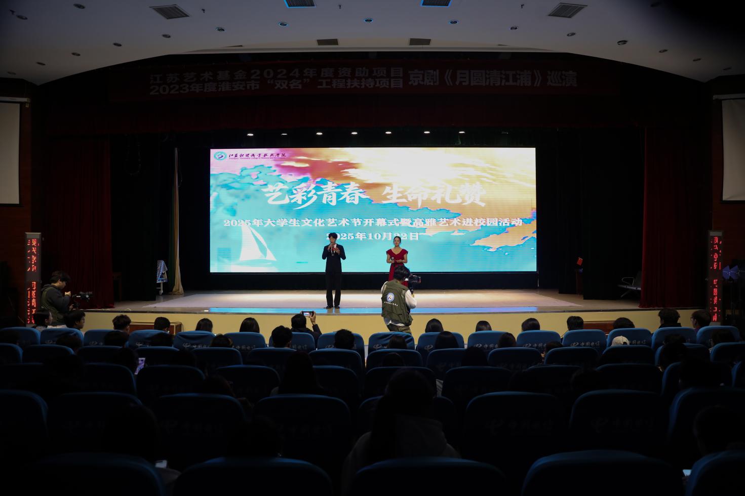 作为开幕式的核心环节,高雅艺术进校园活动特邀江苏省长荣京剧院的艺术家们带来大型京剧《月圆清江浦》经典片段演出。该剧是江苏艺术基金2024年度大型舞台艺术资助项目、2023年度淮安市“双名”工程扶持项目,该剧深深植根于“运河之都”淮安的文化沃土,从里运河畔的烟火气息中汲取灵感,聚焦鲜活的基层人生,将千年运河文化底蕴与人间温情融入婉转唱腔与精湛演绎中。艺术家们的精彩表演让现场师生沉浸式领略了传统京剧的独特韵味,在艺术的熏陶中读懂了生命的灵动与厚重,赢得了全场观众的阵阵掌声。