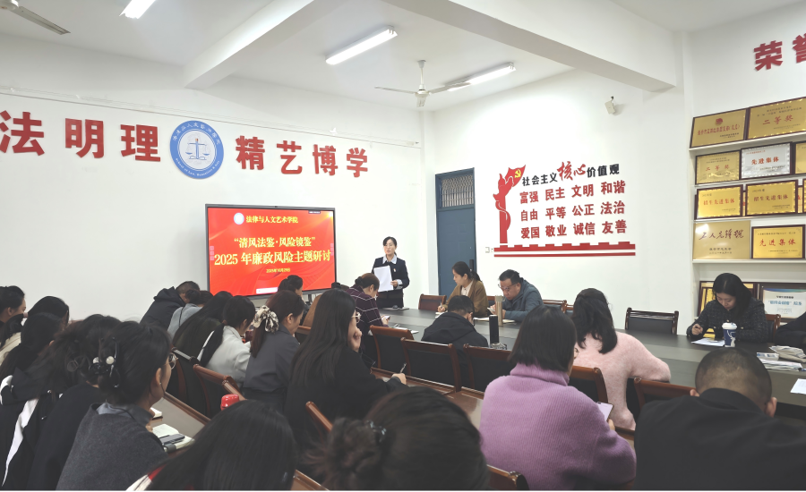 为深入贯彻落实学校《关于开展2025年廉政风险点排查工作的通知》要求,持续压紧压实党风廉政建设“两个责任”,10月29日,法律与人文艺术学院在学院会议室召开“清风法鉴·风险镜鉴”廉政风险主题研讨活动。学院全体教职工参加研讨,会议由学院党总支书记任李主持。