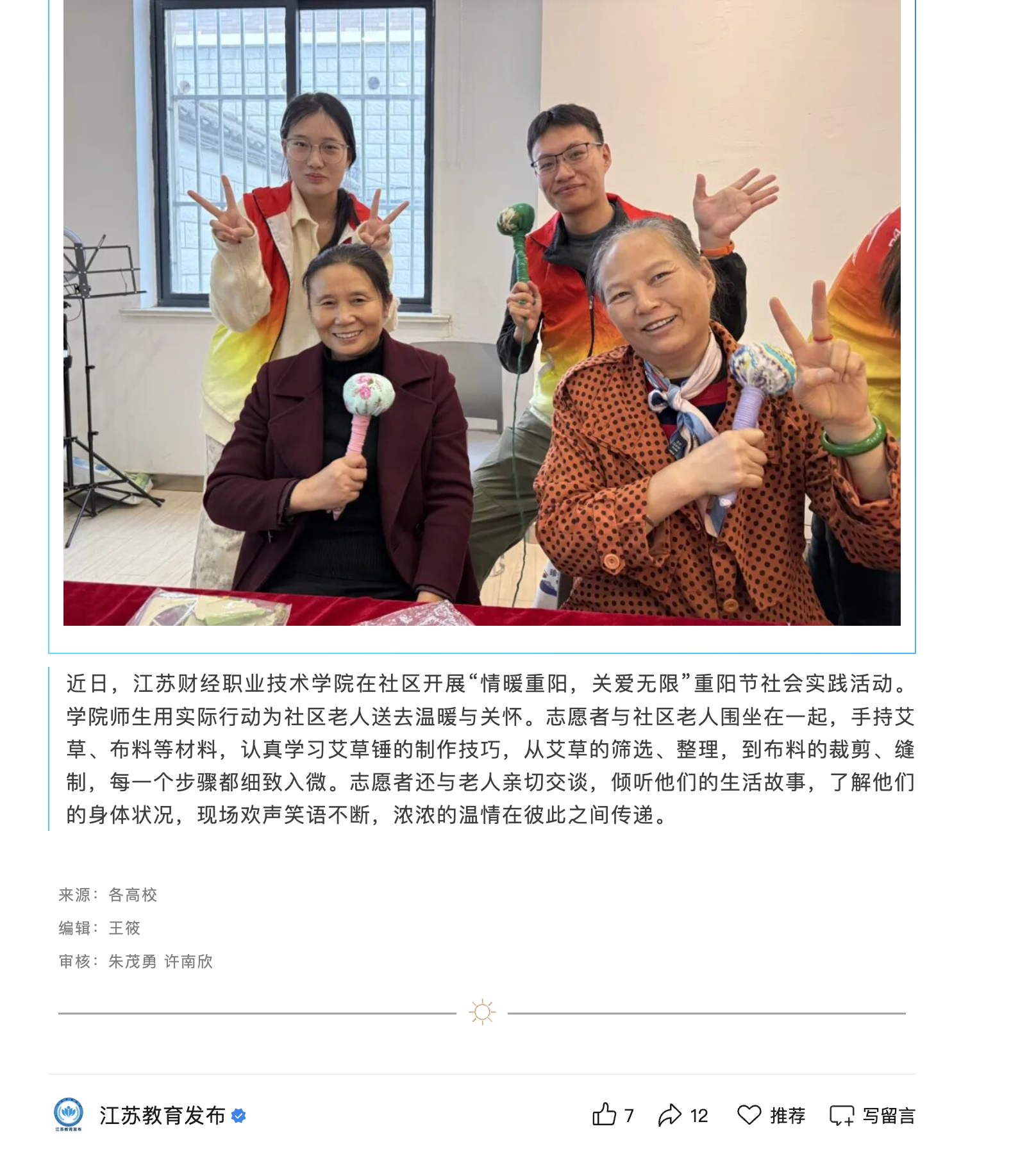 近日,江苏财经职业技术学院在社区开展“情暖重阳,关爱无限”重阳节社会实践活动。学院师生用实际行动为社区老人送去温暖与关怀。志愿者与社区老人围坐在一起,手持艾草、布料等材料,认真学习艾草锤的制作技巧,从艾草的筛选、整理,到布料的裁剪、缝制,每一个步骤都细致入微。志愿者还与老人亲切交谈,倾听他们的生活故事,了解他们的身体状况,现场欢声笑语不断,浓浓的温情在彼此之间传递。