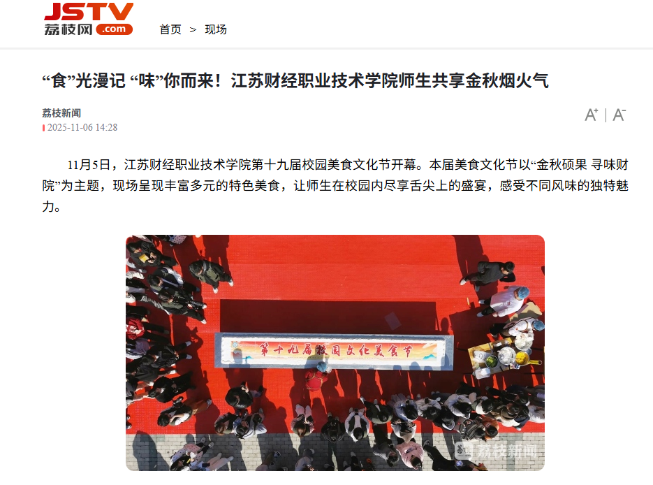 11月5日,江苏财经职业技术学院第十九届校园美食文化节开幕。本届美食文化节以“金秋硕果 寻味财院”为主题,现场呈现丰富多元的特色美食,让师生在校园内尽享舌尖上的盛宴,感受不同风味的独特魅力。