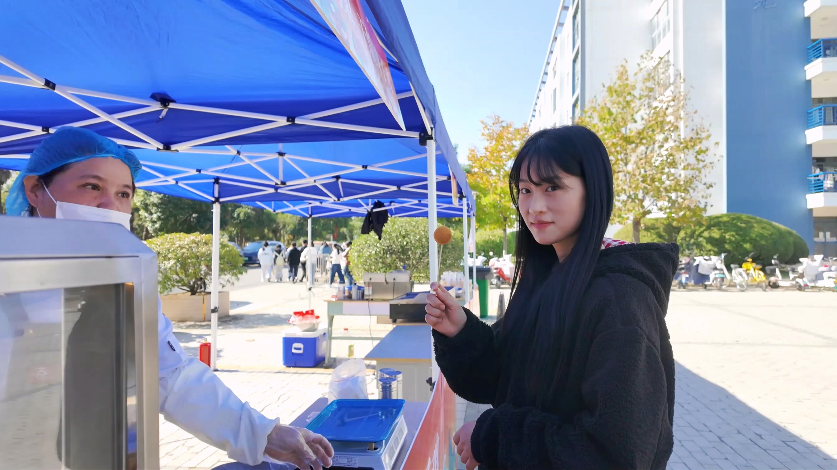 在江苏财经职业技术学院西食堂广场,各式各样的美食琳琅满目,空气中弥漫着各种食物诱人的香气,学生们开心地品尝特色美味。羊肉串,烟火缭绕的终极美味;罐罐烤奶茶,茶香奶韵,治愈人心;棉花糖,每一口都是对童心的直接召唤;烤肠,肉质紧实弹牙,越嚼越香;冰糖葫芦,嘎嘣脆的甜,吃了一颗还想下一颗……此情此景,构成了一幅充满生机与烟火气的校园画卷。来自四川的宋宇诗同学开心地告诉记者,学校搭建了这个美食文化平台,展示学生风采,让她了解到了非遗文化和美食文化,同时也增加了同学们的凝聚力。