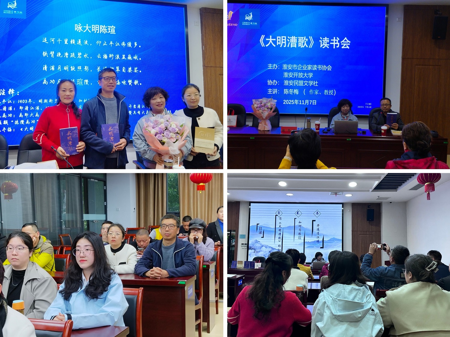 11月7日下午,基础教学部大学语文教研室教师参加由淮安市企业家读书协会和淮安开放大学主办、淮安民盟文学社协办的《大明漕歌》读书分享会。本次活动特邀书籍作者、知名文化学者陈冬梅副教授担任主讲,为大家提供了一次难得的地域文化交流机会。