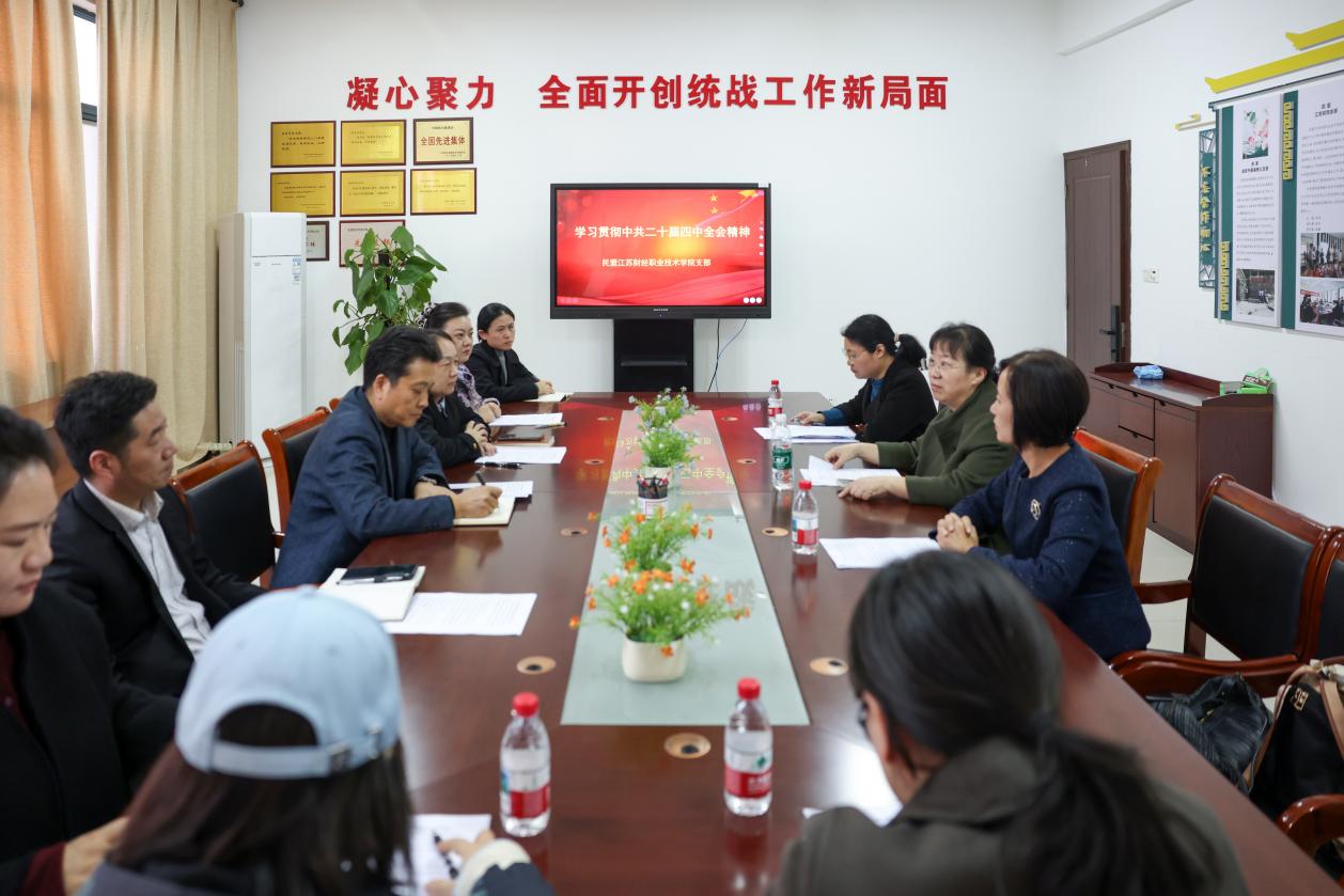 11月12日下午,民盟江苏财经职业技术学院支部在明德楼401会议室召开专题学习会议,深入学习贯彻中共二十届四中全会精神。民盟淮安市委专职副主委朱春霞、秘书长刘彦,校党委委员、统战部部长邹瑄,以及民盟财院支部全体盟员参加会议。