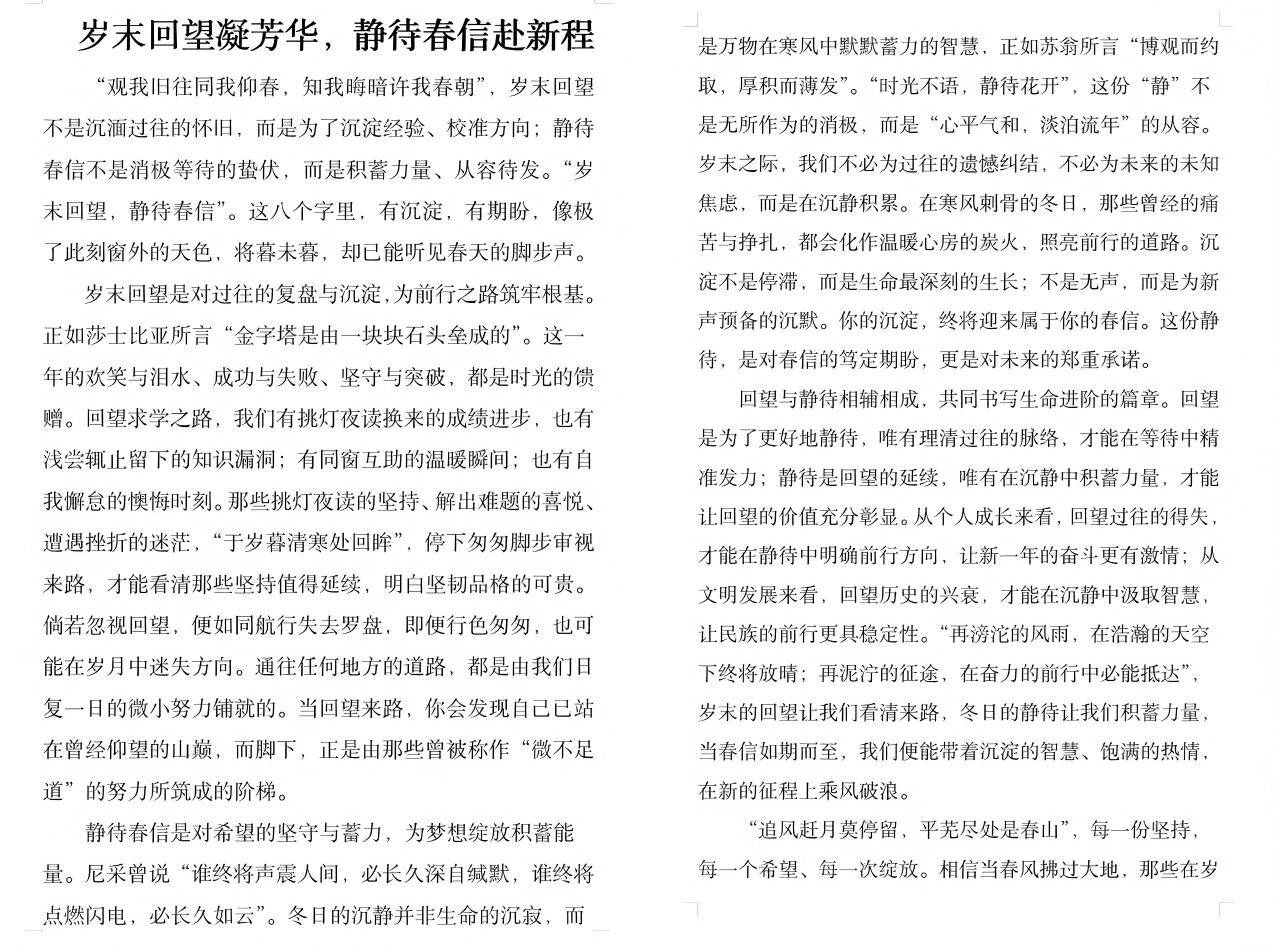 征文板块则以“冬日心绪”与“内在成长”为核心主题,鼓励学生以文字梳理冬日感悟、探寻成长意义。马媛媛、程欣贺两位同学的作品凭借真挚的情感与深刻的思考获得一等奖。这些文字褪去浮华辞藻,以质朴笔触勾勒冬日风骨,于沉静叙事中蕴藏向上的力量,既让读者读懂冬日的厚重与诗意,也传递出寒冬背后的温暖与希望。其中,不少作品围绕“岁末回望,静待春信”展开思考,阐释了回望过往沉淀经验、静待时光积蓄力量的成长智慧,呼应了活动对心理健康与内在成长的引导初衷。