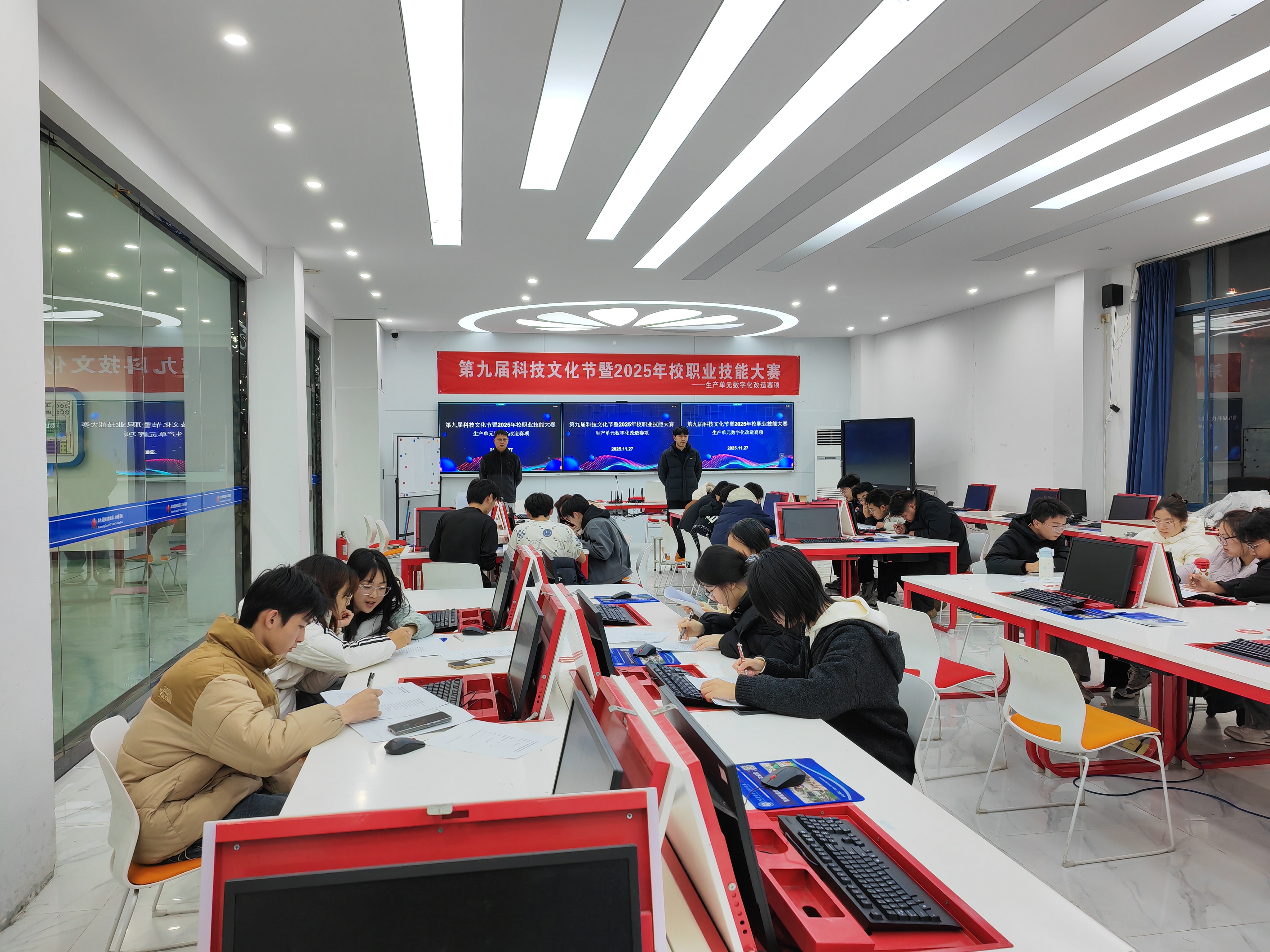 11月27日,学院第九届科技文化节暨2025年校职业技能大赛“生产单元数字化改造”赛项在智能制造综合实训中心华为大数据/物联网实训室圆满落幕。来自智能工程技术学院机电一体化技术、电气自动化技术、大数据应用技术等专业2024级、2025级的40余名同学组成参赛团队,同台竞技展现专业素养与技术能力。