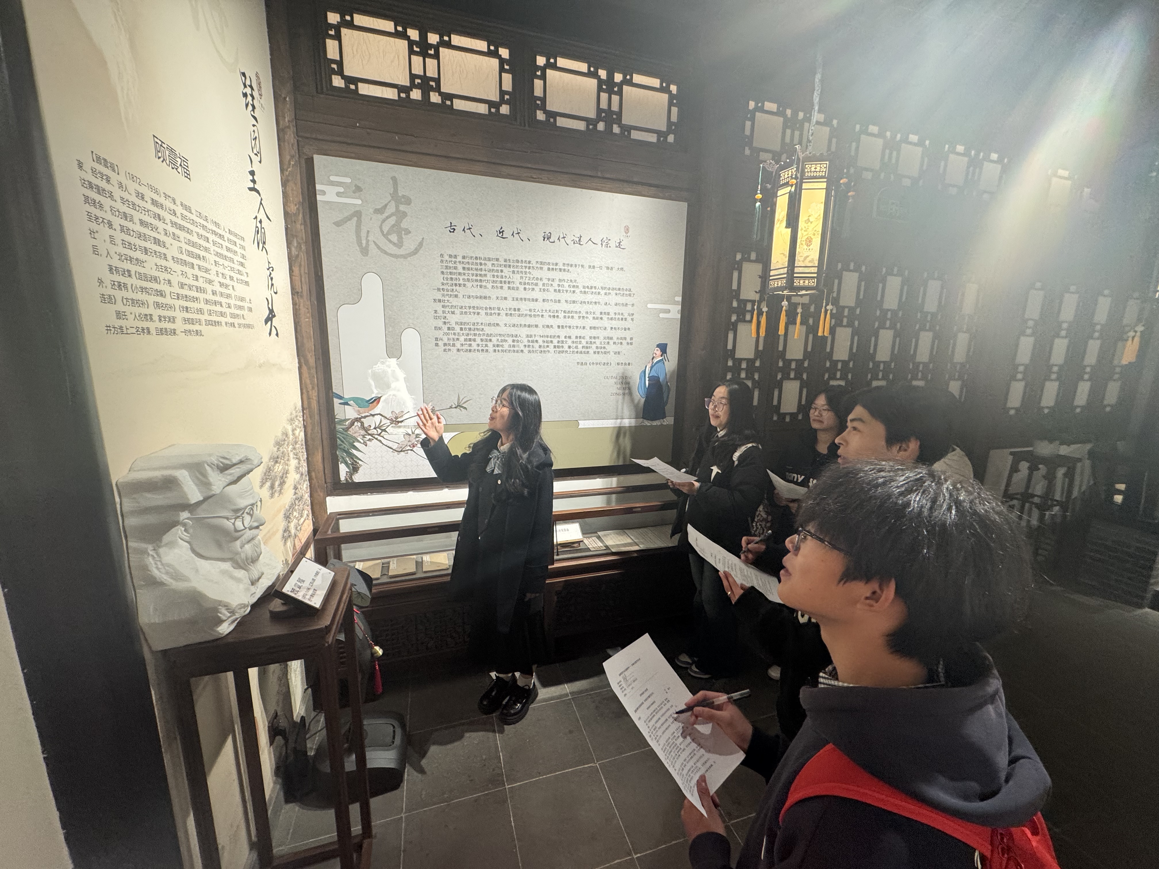 在谜园、灯谜展示馆、灯谜长廊等核心文化景点,讲解团成员结合提前筹备的史料与民俗知识展开讲解。同学们以互动猜谜开篇,生动讲解了谜园的建造背景、灯谜的分类特点,还现场引导大家参与猜谜;在灯谜展示馆,同学们则聚焦馆内珍藏的明清古灯谜手稿、老灯笼展品,详细解读了河下灯谜从文人雅集消遣到民间普及传承的演变历程,将展品背后的文化故事与民俗内涵娓娓道来,让听众深入感受灯谜文化的魅力。讲解过程中,“评分小组”成员手持评分表认真记录,对讲解内容的文化解读深度、语言表达的节奏感、互动环节的设计合理性等细节逐一评分,不时用笔记下亮点与改进建议。除核心讲解环节外,活动还设置了“互评交流”与“灯谜实践”模块。在古镇休息区,指导教师李婧结合评分数据对同学们的讲解进行集中点评,她肯定了同学们“灯谜文化解读精准”、“互动引导自然”等优点,同时指出部分学生“讲解中民俗知识延伸不足”、“语言节奏把控欠佳”、“容易紧张忘词”等问题。同学们纷纷表示,通过此次活动,不仅系统掌握了灯谜文化知识,更学会了如何用生动的语言向他人传递民俗魅力,专业讲解能力得到了切实提升。