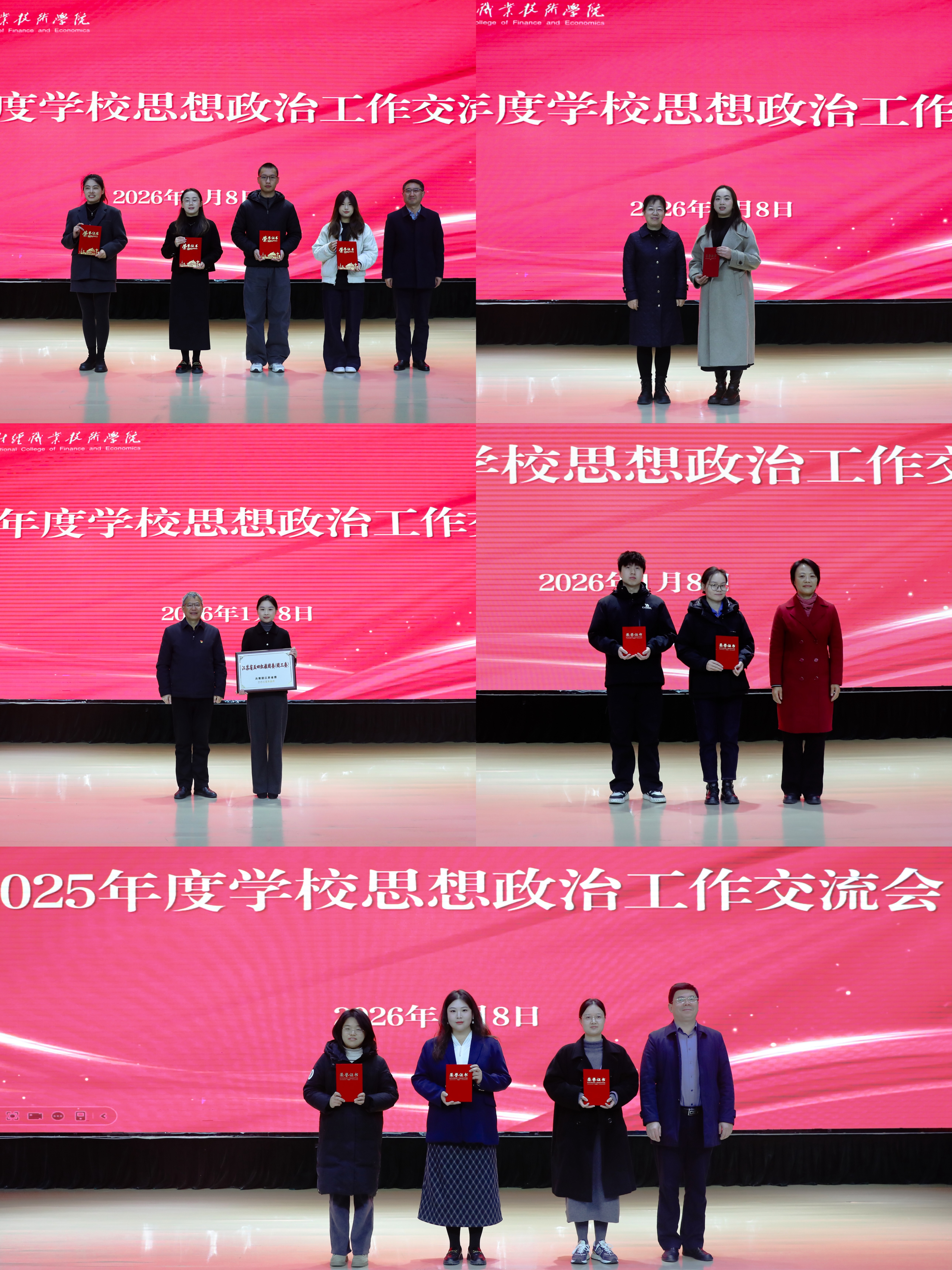 会上,对2025年度“推普助力乡村振兴”全国大学生暑期社会实践志愿服务活动优秀团队、江苏省五四红旗团委,以及在江苏省高校团干部思政技能大比武、第九届“启航杯”江苏省高职院校新教师教学竞赛、江苏省高职院校思政课教师教学展示中获奖的团队和个人进行了表彰。马克思主义学院教师杨瑞、物流与交通旅游学院教师徐笛、金融学院辅导员阚晨雨、法律与人文艺术学院辅导员朱梦圆、马克思主义学院教师孟文玉、会计学院党总支书记罗斌,围绕课程育人、实践育人、网络育人和二级党组织书记如何抓好思想政治和意识形态工作等主题进行了交流发言。