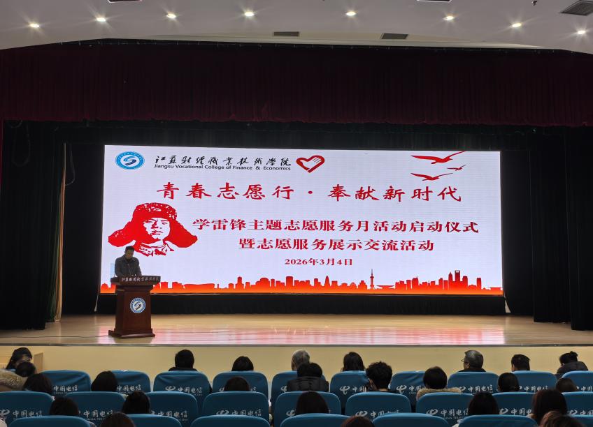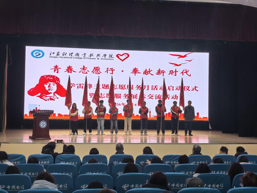 仪式上,淮安市高校红十字会 “博爱青春” 志愿服务项目一等奖负责人张尔佳同学、江苏省高校志愿服务大赛二等奖获得者章茜文同学两位志愿服务先进典型做经验分享;全国大学生暑期社会实践志愿服务活动优秀团队指导老师、江苏省优秀志愿者杨洋老师用自身行动诠释了志愿精神的传承,为我们树立了榜样,团委王珏老师为大家解读2026年学雷锋志愿服务月活动方案;王亚南书记公布我校2026年志愿服务项目立项名单并为各专项志愿者服务队授旗。