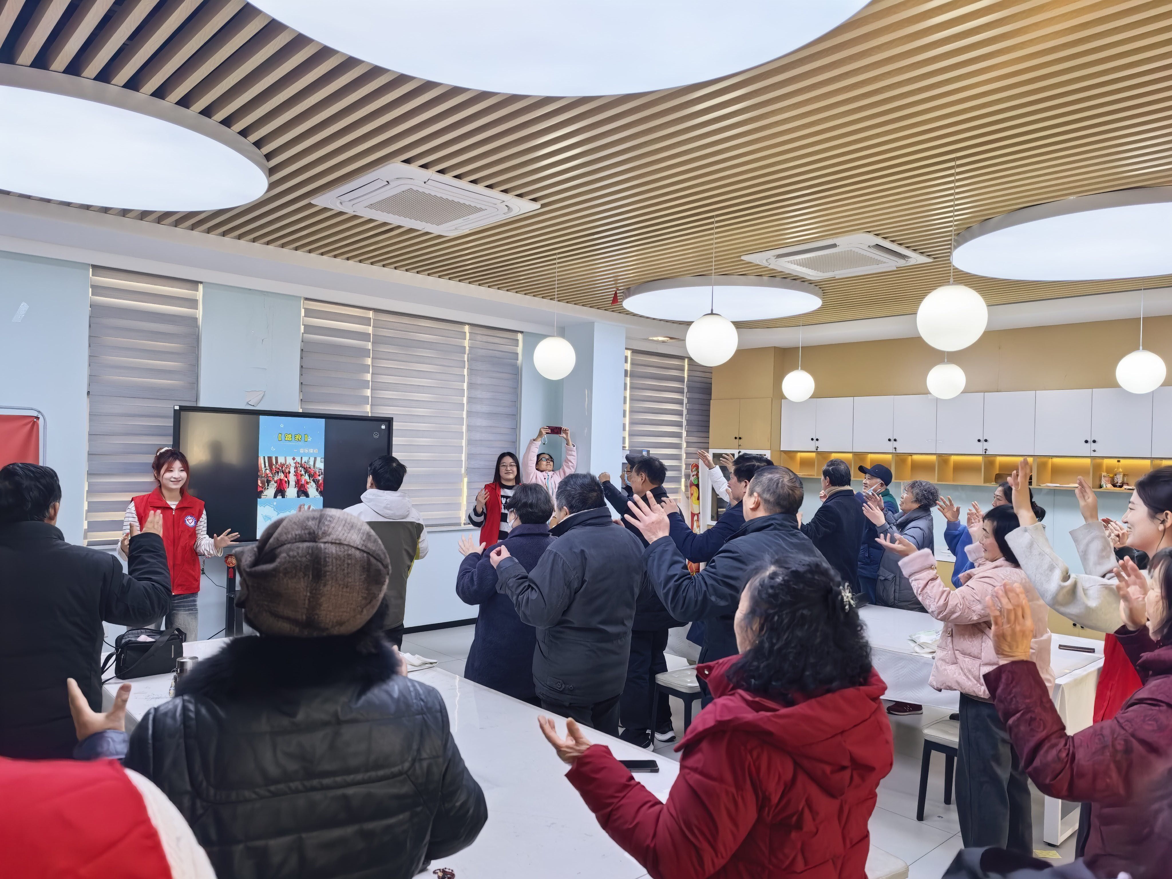 活动伊始,“康乐迎新·热身颐年”环节拉开序幕。志愿者们身着统一志愿马甲,带领老人们做起了简单舒缓的热身操。志愿者们充分考虑到老年人的身体特点,耐心示范每一个动作,弯腰、伸展、转身,节奏舒缓柔和。老人们神采奕奕,跟随志愿者的指引认真模仿,活动室里传递出整齐的节拍声与爽朗的笑声。“这样的热身操简单好做,活动完浑身都舒服!”一位参与活动的阿姨笑着说道,轻松愉快的互动氛围迅速拉近了老少间的距离,为后续活动积蓄了活力。