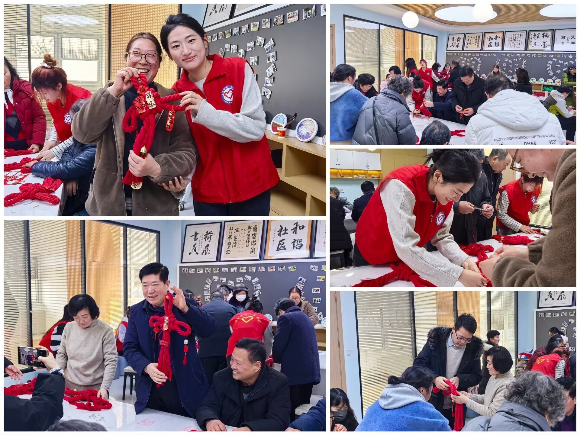 随后的“巧手传承·结彩纳福”环节,志愿者详细讲解了中国结“吉祥团圆”的文化寓意,一对一、手把手教学中国结的编织技法。红绳在指尖穿梭缠绕,一个个寓意美好的中国结逐渐成型。老人们专注投入,时而相互交流技巧,时而向志愿者请教难题,现场气氛其乐融融。