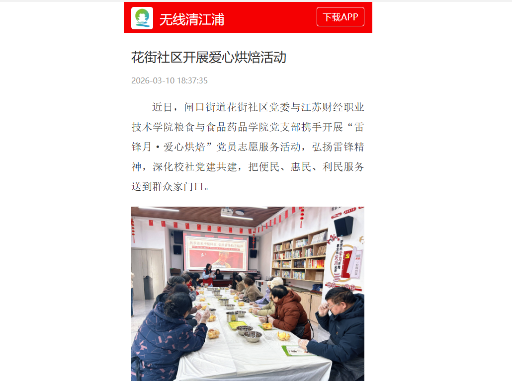 近日,闸口街道花街社区党委与江苏财经职业技术学院粮食与食品药品学院党支部携手开展“雷锋月·爱心烘焙”党员志愿服务活动,弘扬雷锋精神,深化校社党建共建,把便民、惠民、利民服务送到群众家门口。