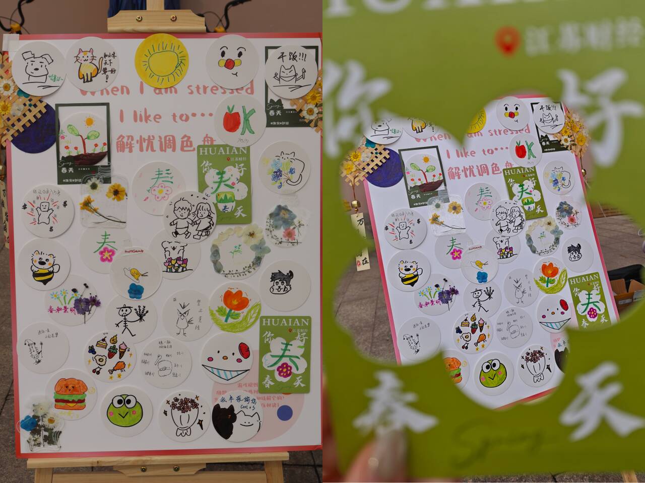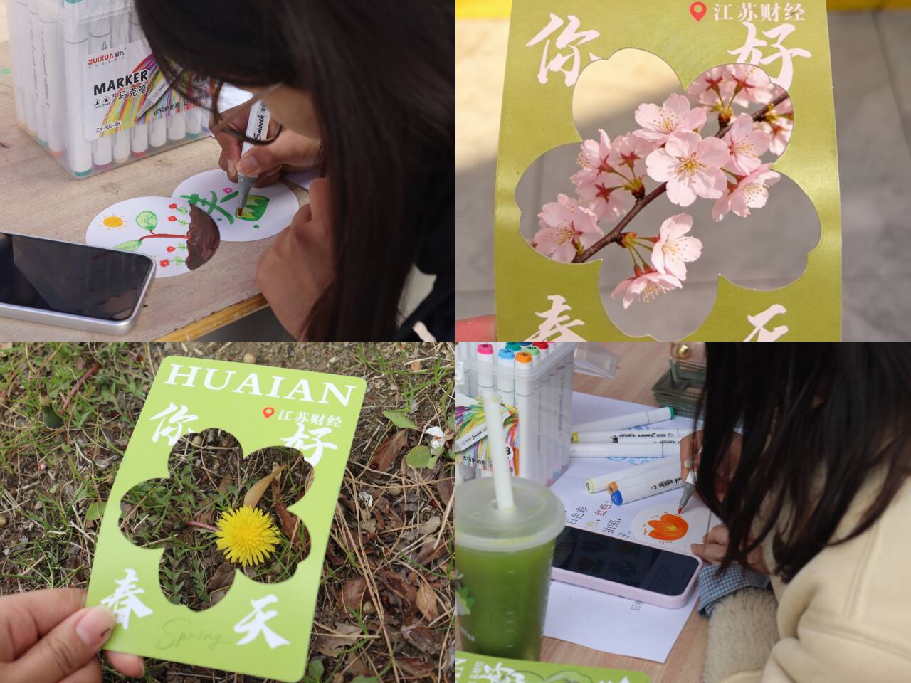 3月20日,东食堂门口的户外场活动热闹启幕,“寻找春天·Color Walk”与“解忧调色盘”两大趣味板块吸引了众多同学驻足参与。在Color Walk打卡区,同学们领取镂空造型卡纸,循着春日气息在校园中探寻绿色、黄色、红色的春日主色调,透过卡纸框取景定格校园春景,用镜头捕捉自然之美,感受春日的生机与活力。