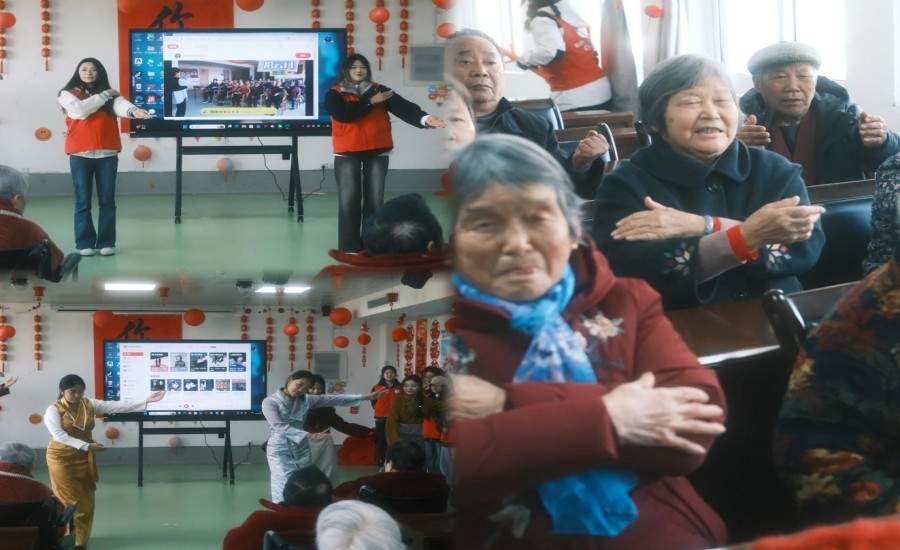活动在热烈温馨的氛围中拉开帷幕。志愿者们精心筹备的文艺汇演轮番上演:藏族舞蹈《锅庄舞》以优美的舞姿展现了浓郁的民族风情;京剧《桃花村》节目妙趣横生;大合唱《小美满》、手势舞《桃花朵朵开》则以温情的旋律传递出对长辈们的真挚祝福。随后,志愿者们化身“领操员”,带领老人们做起《清肺操》,在一招一式间舒展筋骨,现场其乐融融。