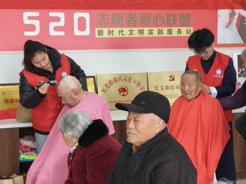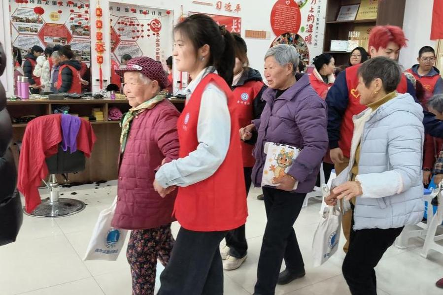 “二月二,龙抬头,风雨顺,好兆头。”志愿者们将传统民俗与志愿服务巧妙融合,设置“爱心义剪”“文艺联欢”“暖心礼包”等互动环节。在"爱心义剪"环节,青年志愿者手持推剪、梳子,耐心询问老人需求,一推一剪间,老人鬓角焕新、笑容绽放,寓意"剃龙头、鸿运当头";在文艺联欢环节,大学生志愿者们带来灵动婉转的民族舞蹈、诙谐幽默的三句半、温情走心的小品,实验小学的孩子们则以一支《如愿》舞扇表演惊艳全场,扇影翩跹间寄托对长辈的美好祝愿。老人们看得津津有味,掌声、笑声此起彼伏。志愿者们不做"旁观者",甘当"传承人",用青春活力让传统佳节"活"起来、"暖"起来。
