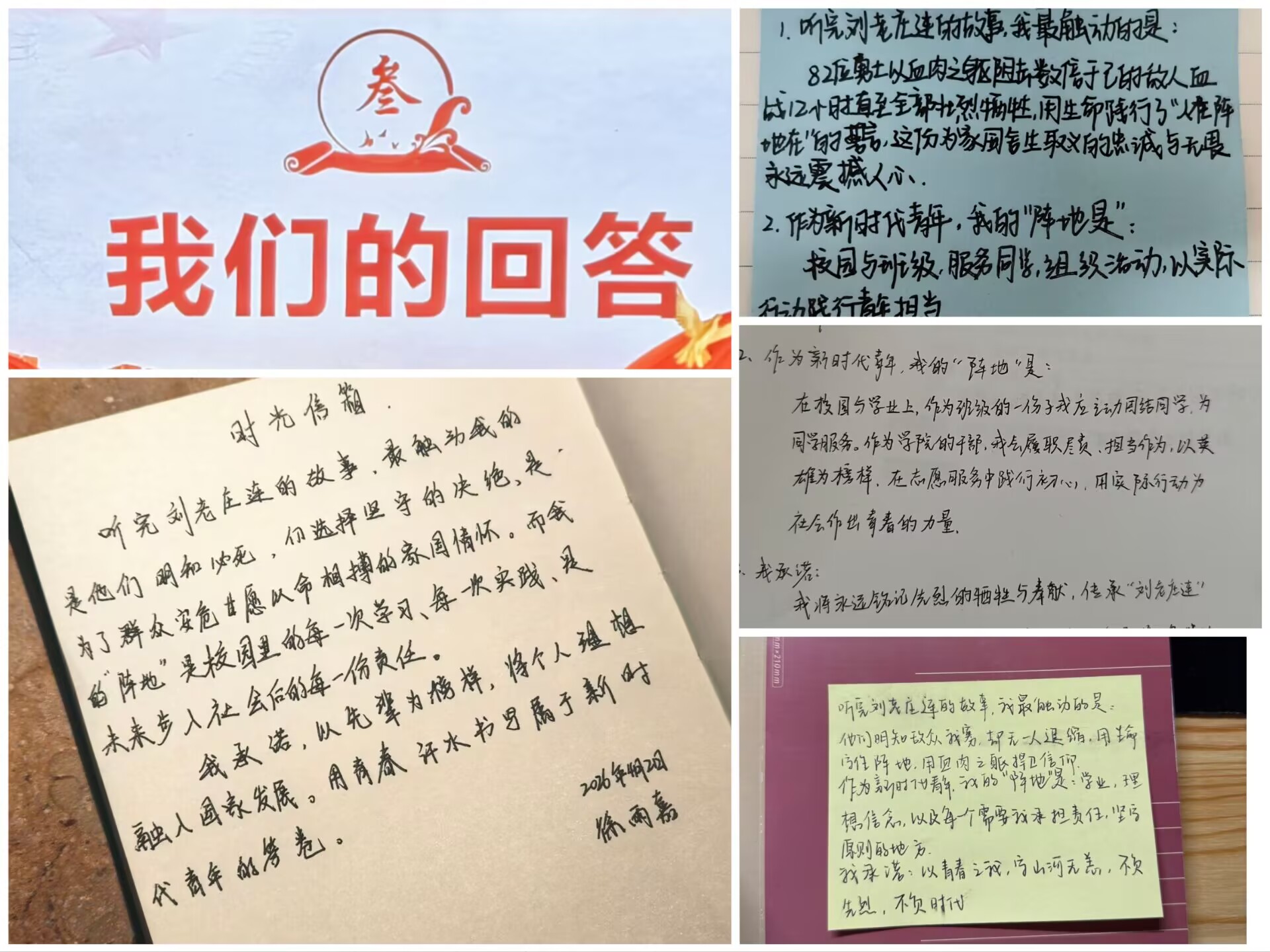 在党课和实境学习结束后,同学们围绕“新时代青年的使命与担当”展开热烈交流,并静心提笔写下给82名勇士的一封封回信。大家一致认为,和平年代的“阵地”不一定是硝烟战场,也可以是教室、宿舍、班级、网络空间等,处处都是青年需要坚守的地方。