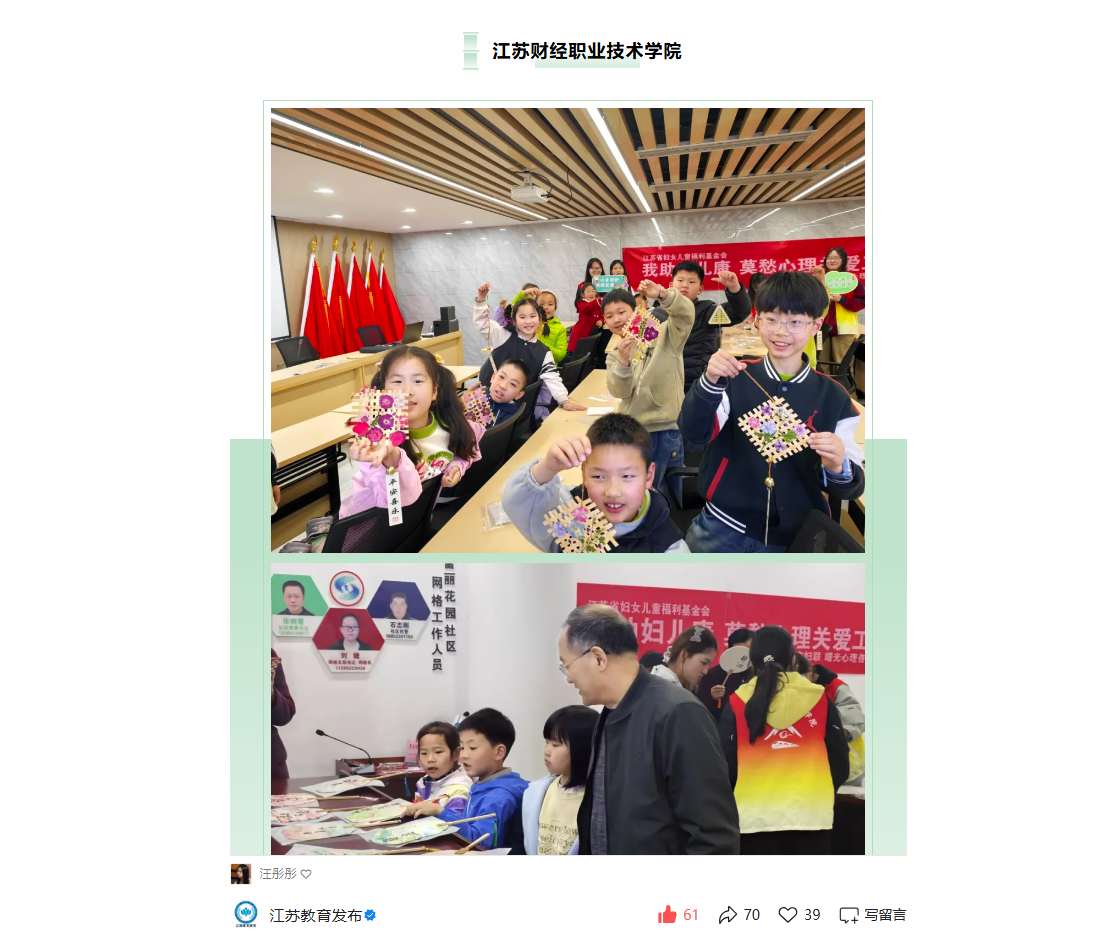 清明织春韵,手作暖童心。江苏财经职业技术学院联动社区开展清明非遗手作关爱活动,用非遗点亮社区儿童春假时光。活动邀请专家与青年志愿者参与,宣讲清明习俗、家风文化,开设情绪管理心理课堂,普及垃圾分类与文明祭扫知识。现场开展漆扇彩绘、竹编风铃非遗体验,手把手指导孩子动手创作,并为孩子们颁发小小非遗传承人证书。此次活动融合非遗传承、心理关怀与绿色理念,以文化润心育人,助力青少年健康成长。