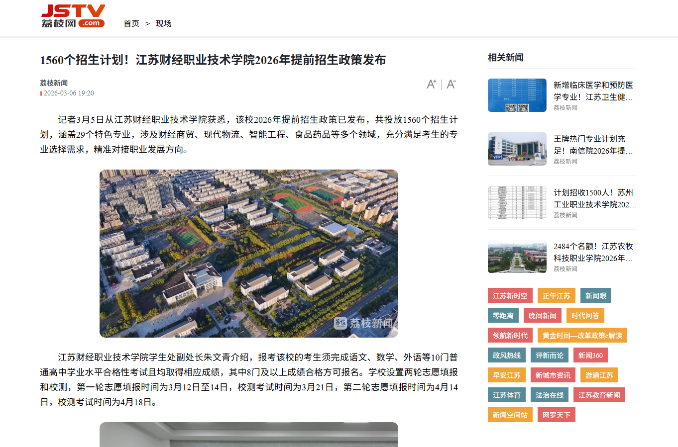 记者3月5日从江苏财经职业技术学院获悉,该校2026年提前招生政策已发布,共投放1560个招生计划,涵盖29个特色专业,涉及财经商贸、现代物流、智能工程、食品药品等多个领域,充分满足考生的专业选择需求,精准对接职业发展方向。