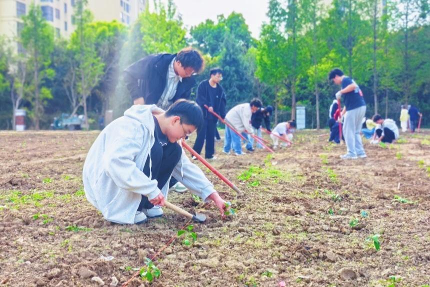 经过2小时的辛勤劳作,同学们看着自己的劳动成果,学生戈畅感慨:“从课本数字到田间实践,真正体会到‘一粥一饭当思来之不易’的含义。后期我会主动承担养护责任,见证它们开花结果。”