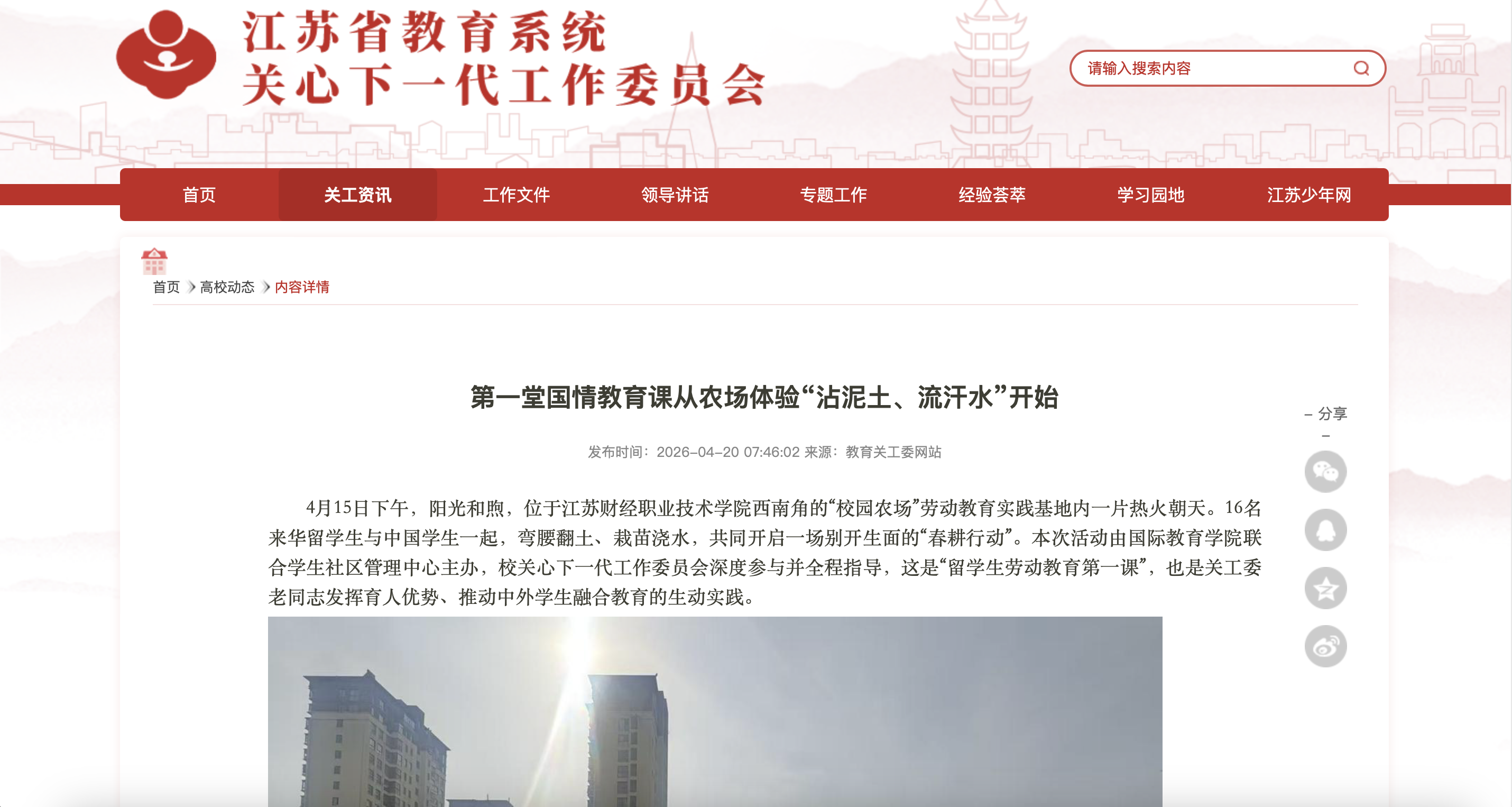 4月15日下午,阳光和煦,位于江苏财经职业技术学院西南角的“校园农场”劳动教育实践基地内一片热火朝天。16名来华留学生与中国学生一起,弯腰翻土、栽苗浇水,共同开启一场别开生面的“春耕行动”。本次活动由国际教育学院联合学生社区管理中心主办,校关心下一代工作委员会深度参与并全程指导,这是“留学生劳动教育第一课”,也是关工委老同志发挥育人优势、推动中外学生融合教育的生动实践。